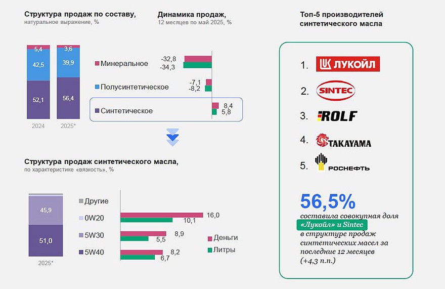 В ТОП-5 рынка синтетических моторных масел в РФ входят: «Лукойл», SINTEC, Rolf, Takayama и «Роснефть». При этом совокупная доля обладателей «золота» и «серебра» в этом рейтинге составляет 56,5% от всех продаж в сегменте (прибавка за отчётный период составила 4,3 процентных пункта). Стоит отметить, что этот прирост зафиксирован на фоне смещения спроса в пользу синтетических масел, а также постепенного сокращения интереса к менее известным брендам.