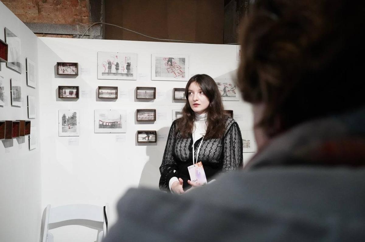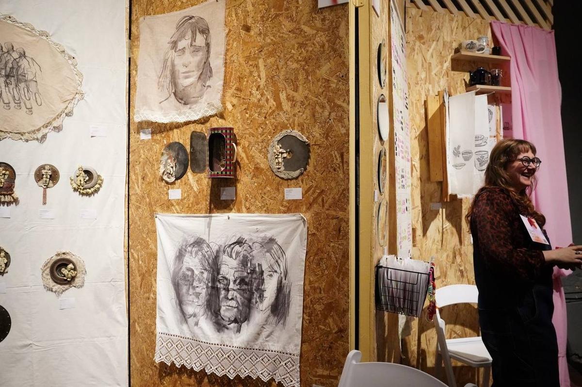 — У нас порядка 32 человек сейчас занимаются в мастерских, — комментирует куратор стенда. — Тема пятого выпуска ярмарки — «соавторство» — нам очень близка, созвучна, потому что цель нашего проекта — это как раз заботливое кураторское менторство художников, которые у нас представлены.