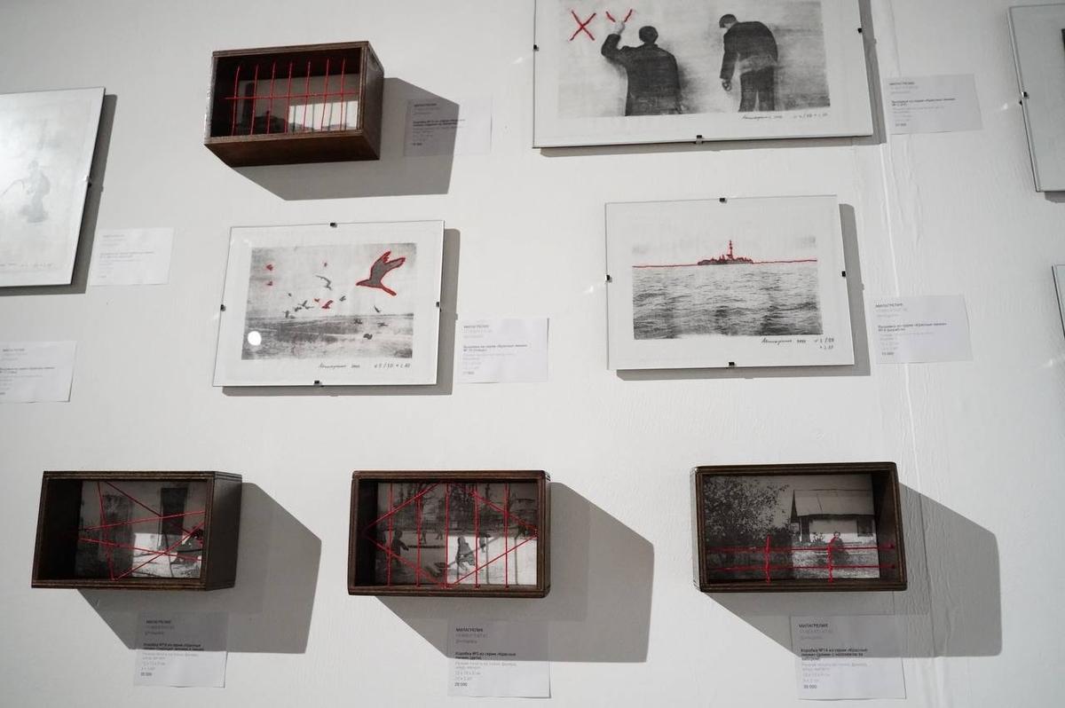 — Я художница Милагрелия. Здесь представлены мои работы из серии «Красные линии». Красные линии — это такое устойчивое выражение о любых красных линиях — личных, межличностных, может быть, о линиях отношений. И здесь у меня представлены сюжеты о самих линиях и о тех, кто с ними столкнулся. Вот — заборы детских садиков, которые мы все помним, например.