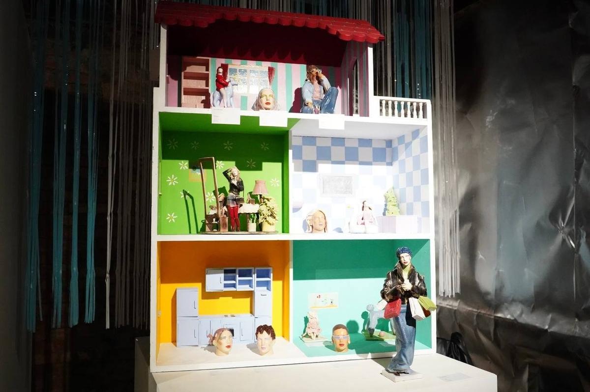 Напротив «носкозвери» — существа, сшитые из старой одежды, и тёплое покрывало. Рядом стенд галереи «Гараж» (да, всё же галерея на выставке есть, хотя, видимо, и проходит как «творческое объединение»). Возле него «кукольный домик» Веры Латышевой с фарфоровыми обитателями …