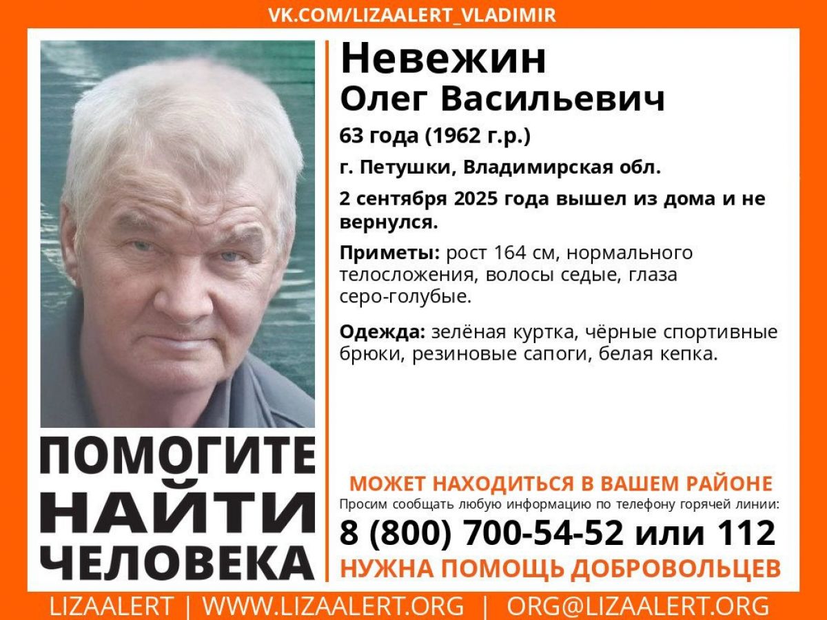 Во Владимирской области ищут 63-летнего Олега Невежина. Как сообщает поисковый отряд «ЛизаАлерт», 2 сентября в городе Петушки он вышел из дома и не вернулся до сих пор. Его рост 164 см, он нормального телосложения с седыми волосами и серо-голубыми глазами. Был одет в зелёную куртку, чёрные спортивные брюки, резиновые сапоги и белую кепку. Любую информацию о его местонахождении просят сообщить по телефону 8 (800) 700-54-52 или 112. Поисковый отряд «ЛизаАлерт»