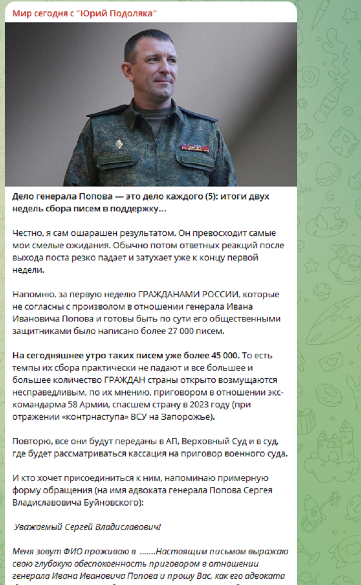 Между тем Царьград не первый раз задаётся вопросом: почему в таком случае не нашлось места на СВО для "народного генерала" Ивана Попова? Человека, о котором сами люди говорят, что "его вина лишь в том, что сказал правду и назвал вещи своими именами".
