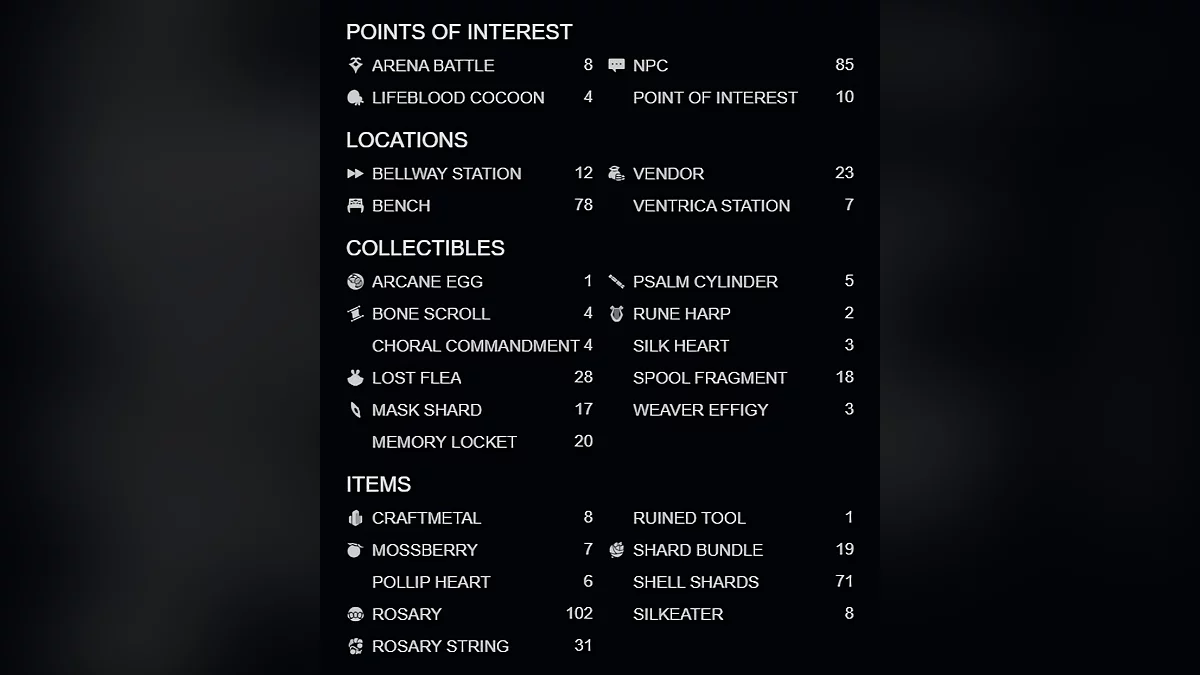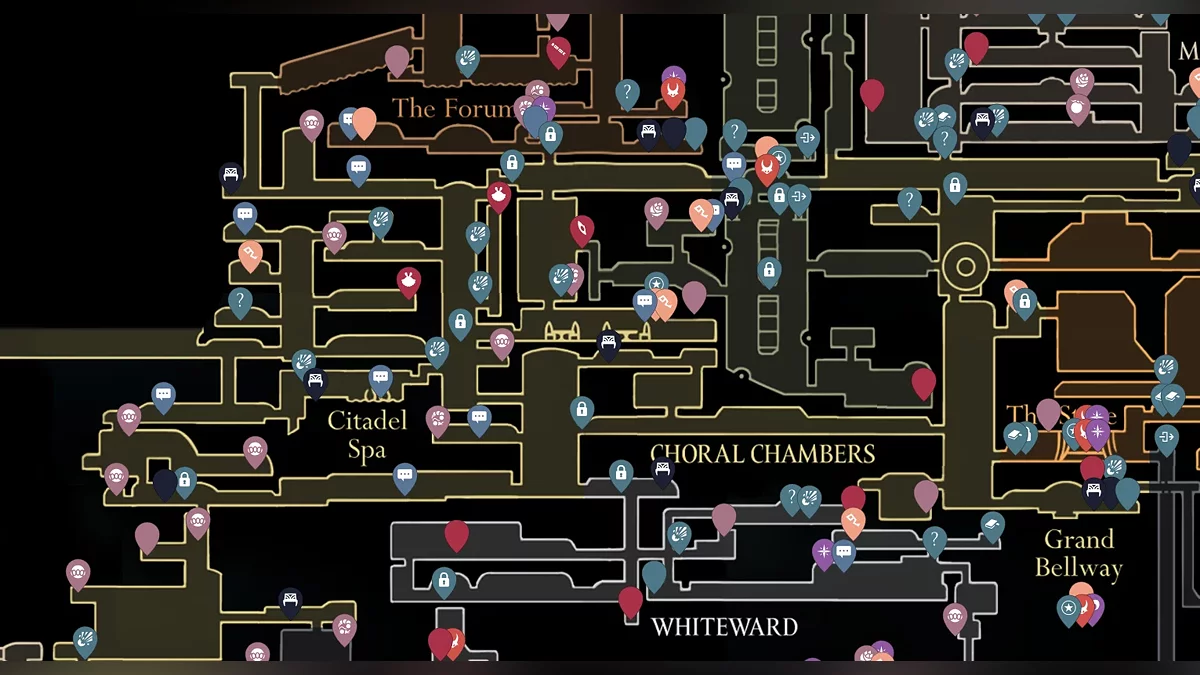 На карте отмечено расположение NPC, торговцев, боссов, скамеек (Bench), станций для быстрого перемещения (Bellway Station), расходных предметов, включая чётки (Rosary String), бусины (Rosary) и болотные ягоды (Mossberry), снаряжение, а также коллекционных предметов — потерявшихся блох (Lost Flea), осколков маски (Mask Shard), медальонов памяти (Memory Locket), шёлковых сердец (Silk Heart), фрагментом катушки (Spool Fragment), костяных свитков (Bone Scroll) и не только.