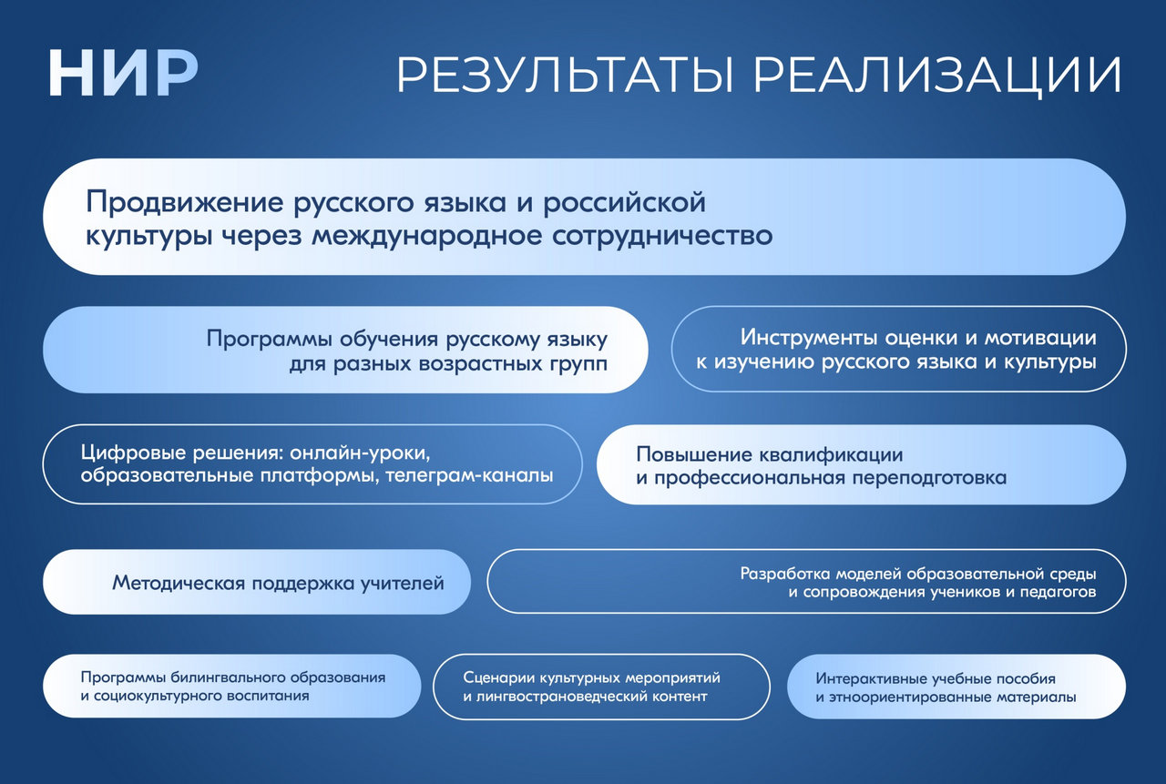 Подведомственные Министерству просвещения Российской Федерации вузы в 2024 году выполнили 26 научно-исследовательских работ (НИР) по продвижению русского языка и российского образования за рубежом.