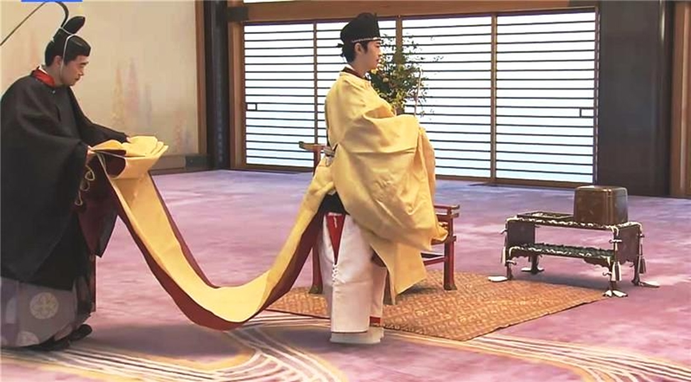После скромной церемонии, которая остаётся неизменной на протяжении веков, камергер приносит шкатулку, открывает её и возлагает на голову молодого принца взрослый головной убор. Головной убор, называемый каммури, появился при императорском дворе около VIII века. Его носили придворные, аристократы и принцы императорской семьи. С течением веков ношение головного убора исчезло, но он оставался важным символическим элементом и надевался во время некоторых императорских церемоний. Этот головной убор характеризуется длинным шлейфом из тонкого шёлка, ниспадающим на затылок.