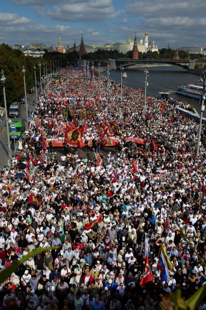 Более 100 тысяч русских людей (по некоторым данным - до 200 тысяч; подсчитывать не берёмся, налицо необъятное святое человеческое море) прошли молитвенным шествием от Храма Христа Спасителя до Новодевичьего монастыря. Около семи километров. Младенцы и пожилые, юные и зрелые. Все приехали сами, по собственному почину, а не по разнарядке.