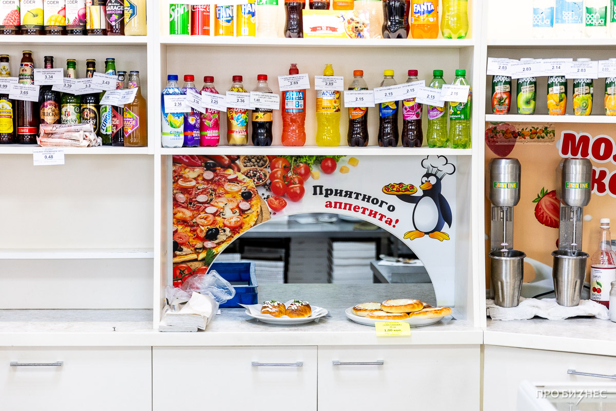 В пиццериях «Пингвин» реализуют и сопутствующие товары — на полках можно увидеть молоко, сметану, сливочное масло, мороженое, чипсы с наценкой в районе 15%.