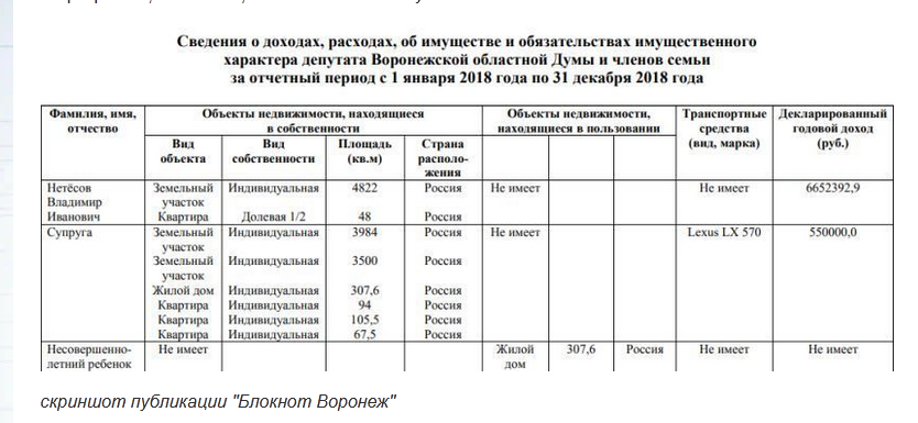 А годом ранее у супруги Нетесова были всего-то жилой дом в 307 кв метров и одна квартира 94 метра, да Lexus LX570. То есть две квартиры в собственности супруги Нетесова в 2018-м появились при ее годовом доходе (за 2017 г. ) 454 тыс рублей. За 2018 год доход супруги Нетесова был 550 тыс рублей, а в имуществе три квартиры, жилой дом (307 кв м) и пара земельных участков. Источник покупки сразу за год двух квартир, общей площадью под 170 кв м., указан не был.
