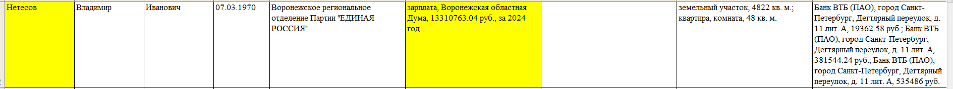 В данных о доходах и имуществе за 2024 год у Владимира Нетесова значится единственный источник доходов – зарплата в Воронежской облдуме. Ее размер составил 13 млн 310 тысяч 763 рубля и 4 копейки.