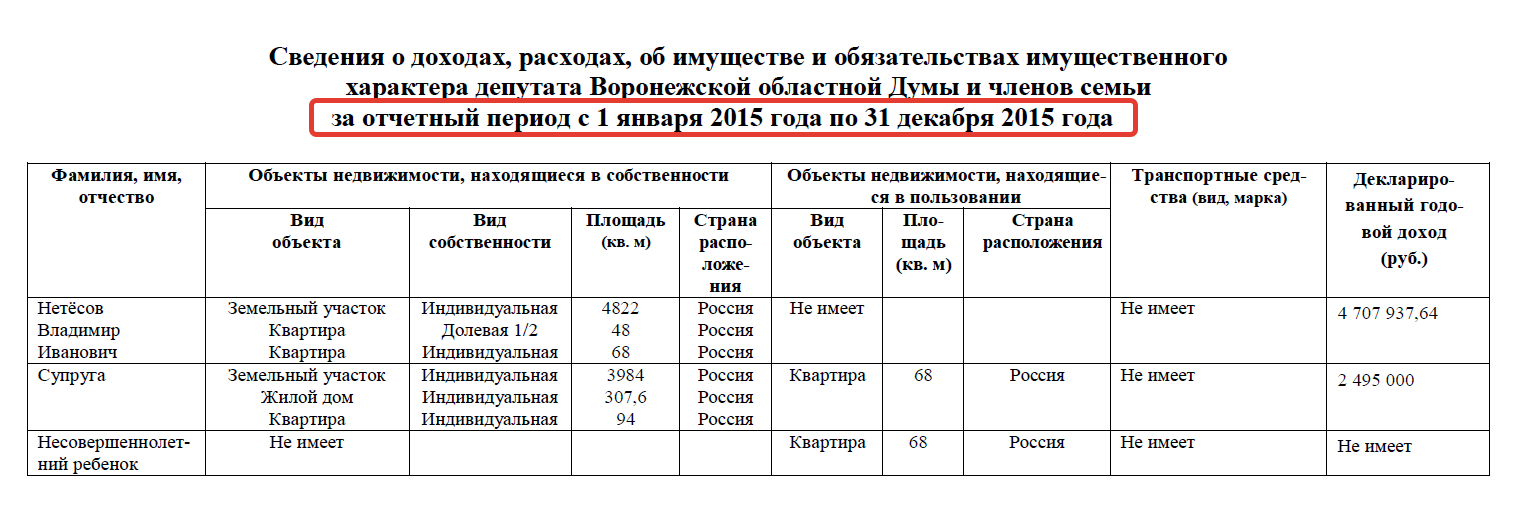 Накануне Избирательная комиссия Воронежской области официально опубликовала данные о доходах и имуществе зарегистрированных кандидатов в депутаты Воронежской облдумы, как по единому избирательному округу, так и по одномандатным округам. В одном из этих списков есть и Владимир Иванович Нетесов. Он выдвинут в депутаты региональным отделением партии «Единая Россия».