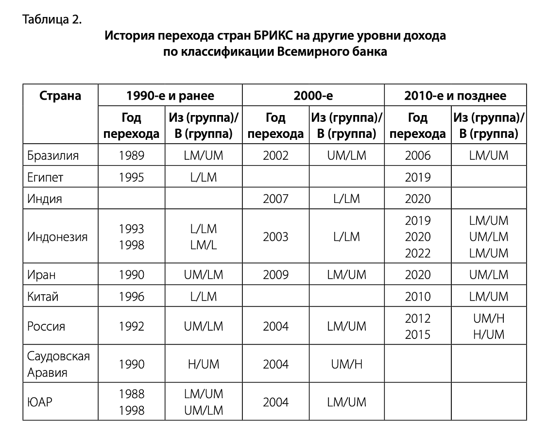 Две страны – Эфиопия и Объединённые Арабские Эмираты – на протяжении 1990–2023 гг. не переходили из одной группы в другую, и поэтому не включены в таблицу. ОАЭ всё это время находились в группе с высоким уровнем дохода, их основной этап экономического роста связан с открытием месторождений нефти в 1950–1960-х гг. и резким ростом цен на неё в 1973 и 1980 годах. Эфиопия до сих пор остаётся в группе с низким уровнем дохода. Там самая высокая доля сельского хозяйства в ВВП среди стран БРИКС, и при прочих равных условиях можно говорить, что она находится на стадии традиционного общества с высокой долей натурального сельского хозяйства, хотя этот показатель снизился с 53 процентов в 1985 г. до 35 процентов в 2020 году. Доля промышленности значимо выросла за аналогичный период – с 9 до 23 процентов. Таким образом, Эфиопия не перешла в другую группу, но демонстрирует высокие темпы роста и структурные изменения в экономике, поэтому можно ожидать перехода на новый уровень развития в среднесрочном периоде.