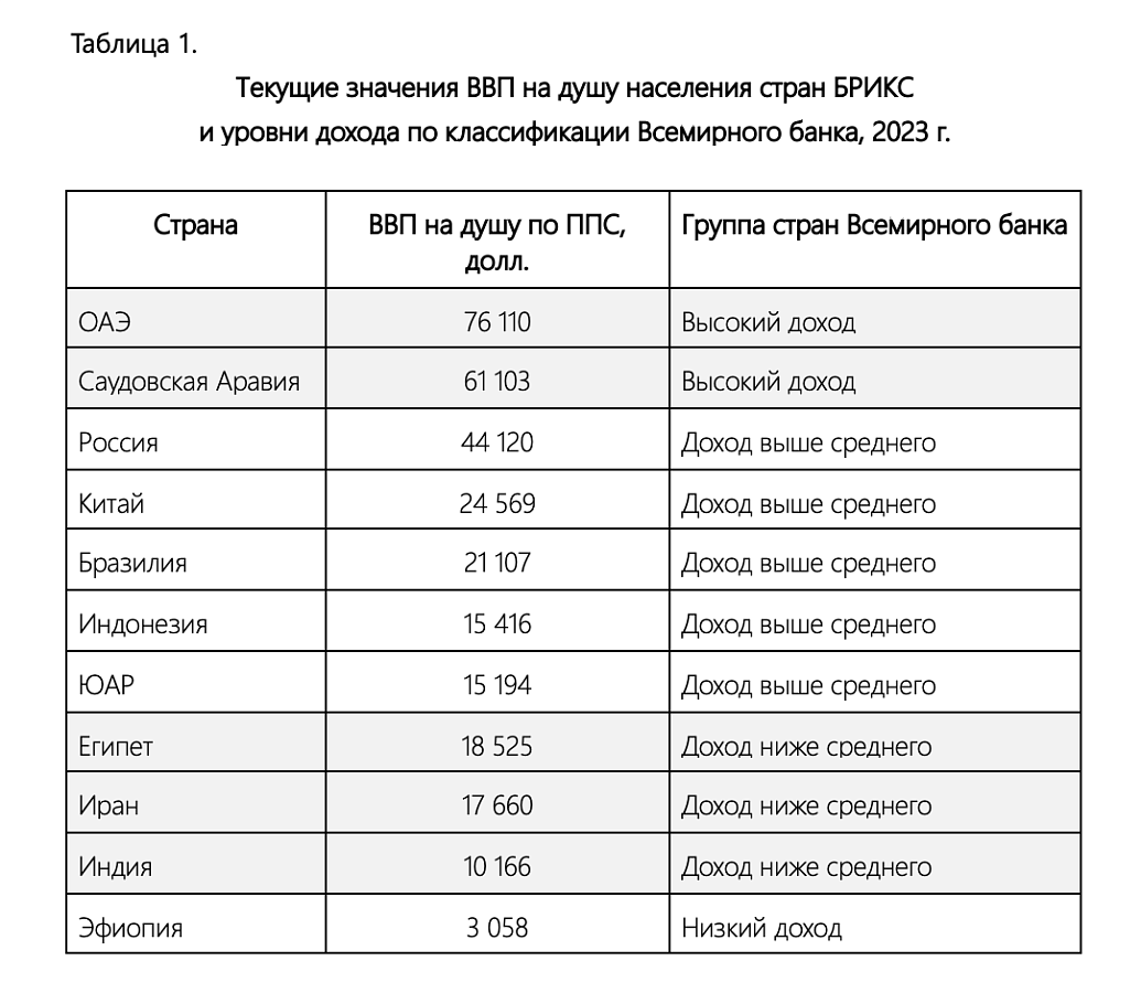 По данным Всемирного банка по состоянию на 2023 г., в странах БРИКС разный уровень дохода на душу населения – от высокого (ОАЭ, Саудовская Аравия) до низкого (Эфиопия) (табл. 1). Классификация проводится по уровню валового национального дохода на душу населения, пересчитанного по методу Атласа, который включает уровень национальной инфляции относительно уровня инфляции в странах-эмитентах корзины SDR (специальных прав заимствования). Поскольку инфляция в Иране и Египте стабильно выше среднемирового и уровня ЮАР, то читателю не следует удивляться более низкой позиции страны в рейтинге при более высоком ВВП на душу, чем в ЮАР.