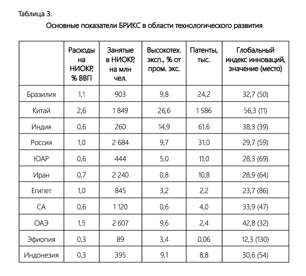 Китай лидирует по всем показателям, включая позицию в Глобальном рейтинге инноваций, который оценивает не только уровень технологического развития, но и развитость рынка и деловой среды, а также благоприятные институты. Однако далее страны БРИКС делят между собой следующие позиции, обладая разными преимуществами. В России, например, много работников с высшим образованием и довольно большая доля исследователей. Индия специализируется на создании медицинских препаратов, одним из высокотехнологичных направлений производства, и также обладает высокой долей высокотехнологичного экспорта.