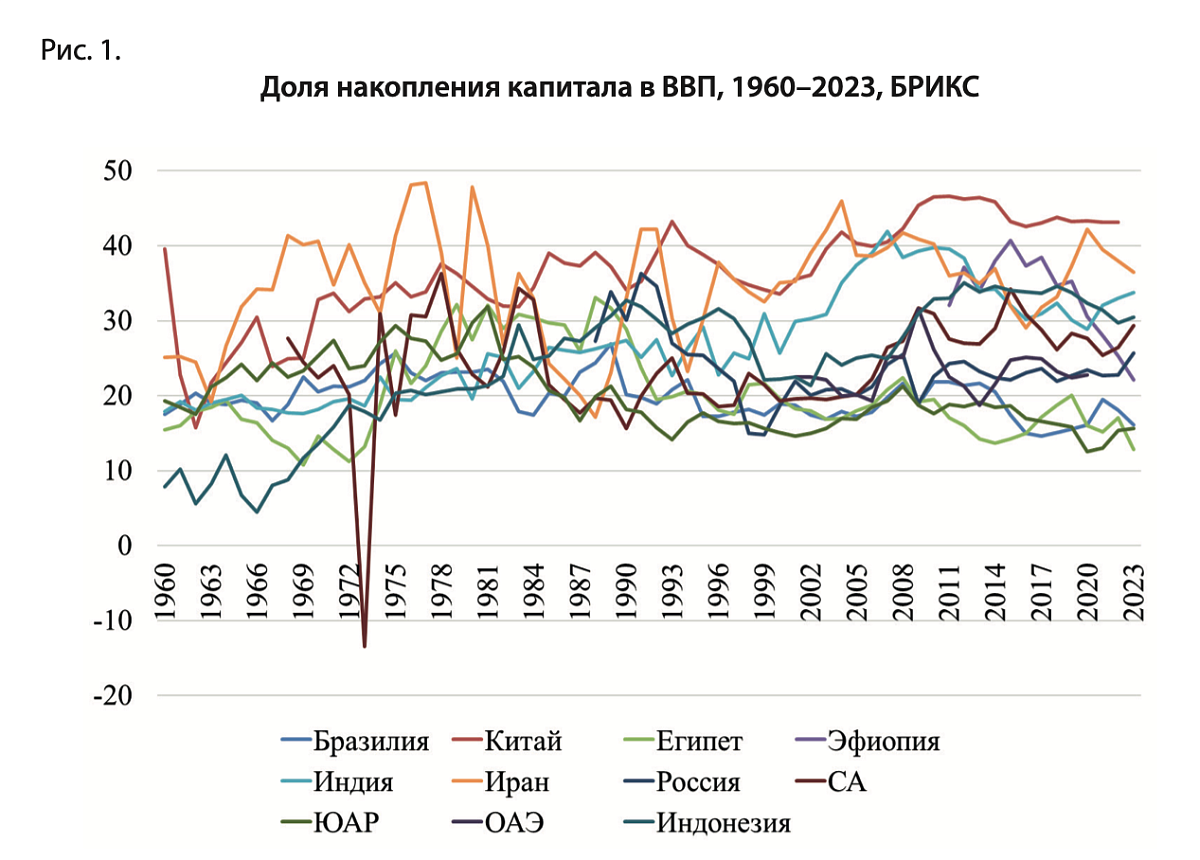 Во всех государствах БРИКС ещё с 1970-х гг. наблюдалось соотношение инвестиций и ВВП выше 10 процентов. Китай, Иран и Индия сейчас показывают наибольшую долю инвестиций в ВВП, что предположительно даёт возможности для перехода на новый уровень развития. В каждой из стран БРИКС наблюдались отдельные периоды роста и высоких значений инвестиций в ВВП. Так, и в Индии, и в Китае этот показатель быстрее всего рос в 2000-е гг., причём в Индии его значения довольно сильно падают после 2010-х гг., а в Китае сохраняются на высоком уровне. Специфика китайской экономики заключается в сохранении высокого уровня сбережений (накопления капитала), более 40 процентов ВВП.