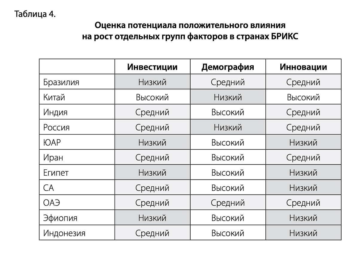 По каждому из факторов мы сделали вывод о перспективах на основании текущего состояния. Так, высокий потенциал инвестиций в Китае (выше 40 процентов ВВП), средний – в странах с уровнем инвестиций от 20 до 40 процентов, низкий – ниже 20 процентов и в Эфиопии, для которой данные пока недоступны, но видно резкое снижение инвестиций в последние несколько лет и сильная зависимость притока капитала в целом от содействия развитию со стороны стран-доноров. По демографическому фактору наиболее высокий потенциал у стран с молодым населением, низкий – у «стареющих» экономик России и КНР. По фактору инноваций наиболее высокий потенциал в Китае, который первенствует по всем показателям. Среди лидеров по всем показателям в области инноваций также находится Россия, однако на уровне намного ниже, чем в Китае, и при низкой доле расходов на НИОКР в ВВП, поэтому потенциал оценён как средний, хотя Россия сохраняет первенство в определённых областях (ядерные технологии, исследования Арктики, реактивные двигатели, материалы и сплавы, космическая промышленность и другие).