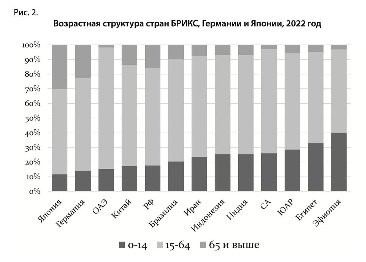 Демография. Структура населения и занятости рассматривается во всех моделях экономического роста, включая современные эндогенные модели. Эмпирические исследования стран БРИКС также показывают значимость демографического фактора[7]. Большая часть стран БРИКС находится в благоприятной ситуации. По состоянию на 2023 г., население 11 стран БРИКС составляло 48,7 процентов мирового населения. Индия и Китай – крупнейшие страны мира по населению, Бразилия и Россия входят в топ-10. Однако для экономического роста наиболее важный фактор – возрастная структура, в особенности доля трудоспособного населения, поскольку с точки зрения роста ВВП важны люди, создающие дополнительную стоимость, а не требующие увеличения социальных трансфертов. Возрастно-половые структуры стран различаются (рис. 2). В частности, в России и Китае население стареет, и в данном случае они могут быть отнесены к странам со снижением роли демографического фактора в экономическом росте. Следует отметить, что здесь также видны различия – в России сокращение населения происходило медленно, а в Китае было ускорено политикой «Одна семья – один ребёнок». Наиболее благоприятная ситуация и возможности для роста за счёт прибавления трудоспособного населения сложилась в Эфиопии, Египте, Индии, Бразилии и Индонезии. По демографической структуре выделяются ОАЭ, где среди населения трудоспособного возраста (83 процента) преобладают мигранты. Для сравнения приведена возрастная структура Японии и Германии, отличающихся высокой долей лиц пенсионного возраста.