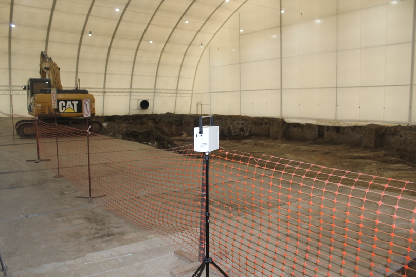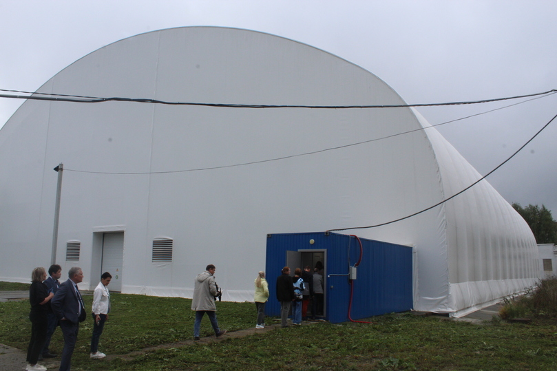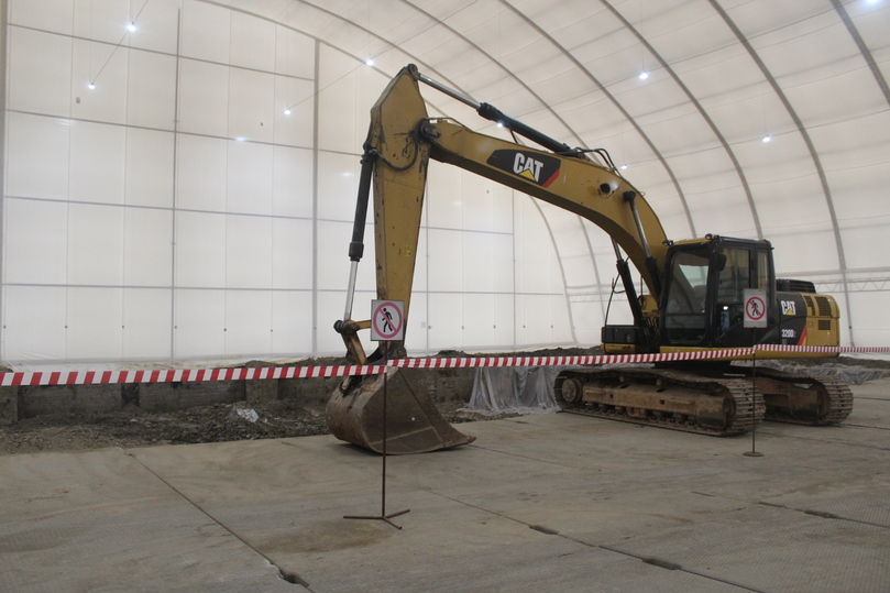 «Работы на участке мы начали в 2022 году с создания необходимой инфраструктуры», – поясняет Юрий Скосырский. Сейчас над могильником располагается каркасно-тентовый ангар, который сотрудники УЭКХ в шутку называют «шапито». Перед тем как пройти внутрь, нам приходится облачиться в защитную спецодежду. Внутри мы видим бетонные плиты, которые постепенно демонтируются, а затем экскаватор извлекает с четырехметровой глубины отходы, которые хранятся здесь с середины прошлого века.