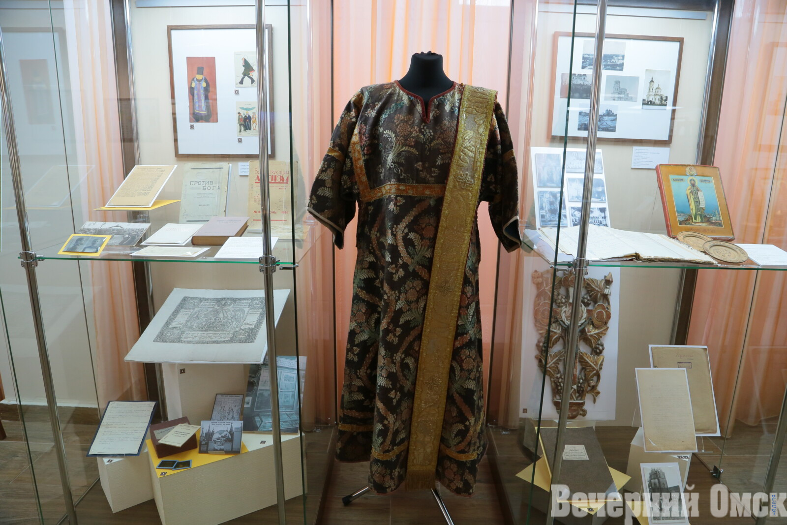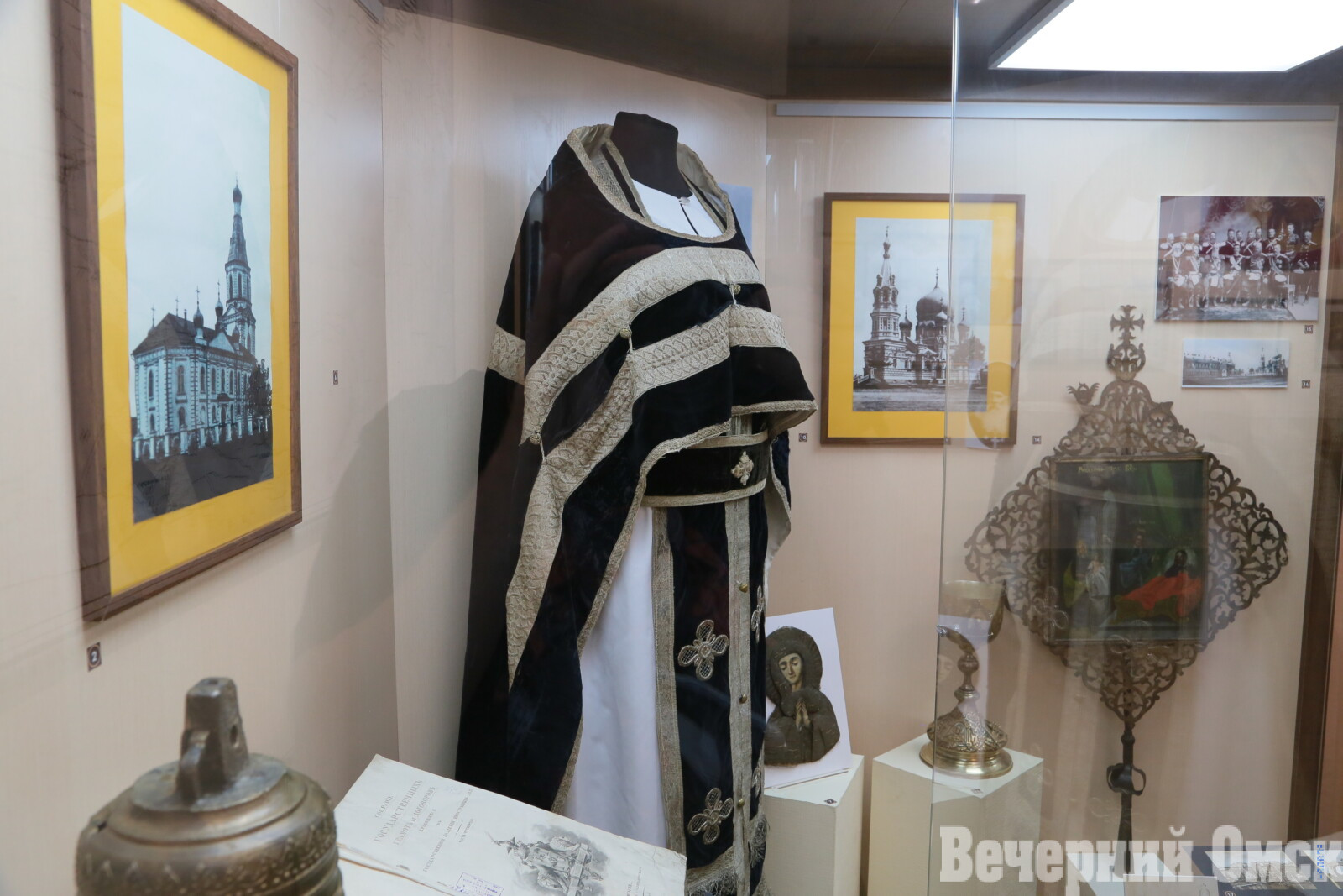 Открывает экспозицию картина «Вид Омской крепости в 1854 году» – на ней в центре композиции красуется Воскресенский военный собор, духовное сердце доепархиального Омска. Рядом в стеклянной витрине покоится главная жемчужина всей коллекции – напрестольное Евангелие 1674 года в массивном окладе. На его страницах – дарственная надпись о том, что книга была пожертвована в собор лично императрицей Екатериной II.