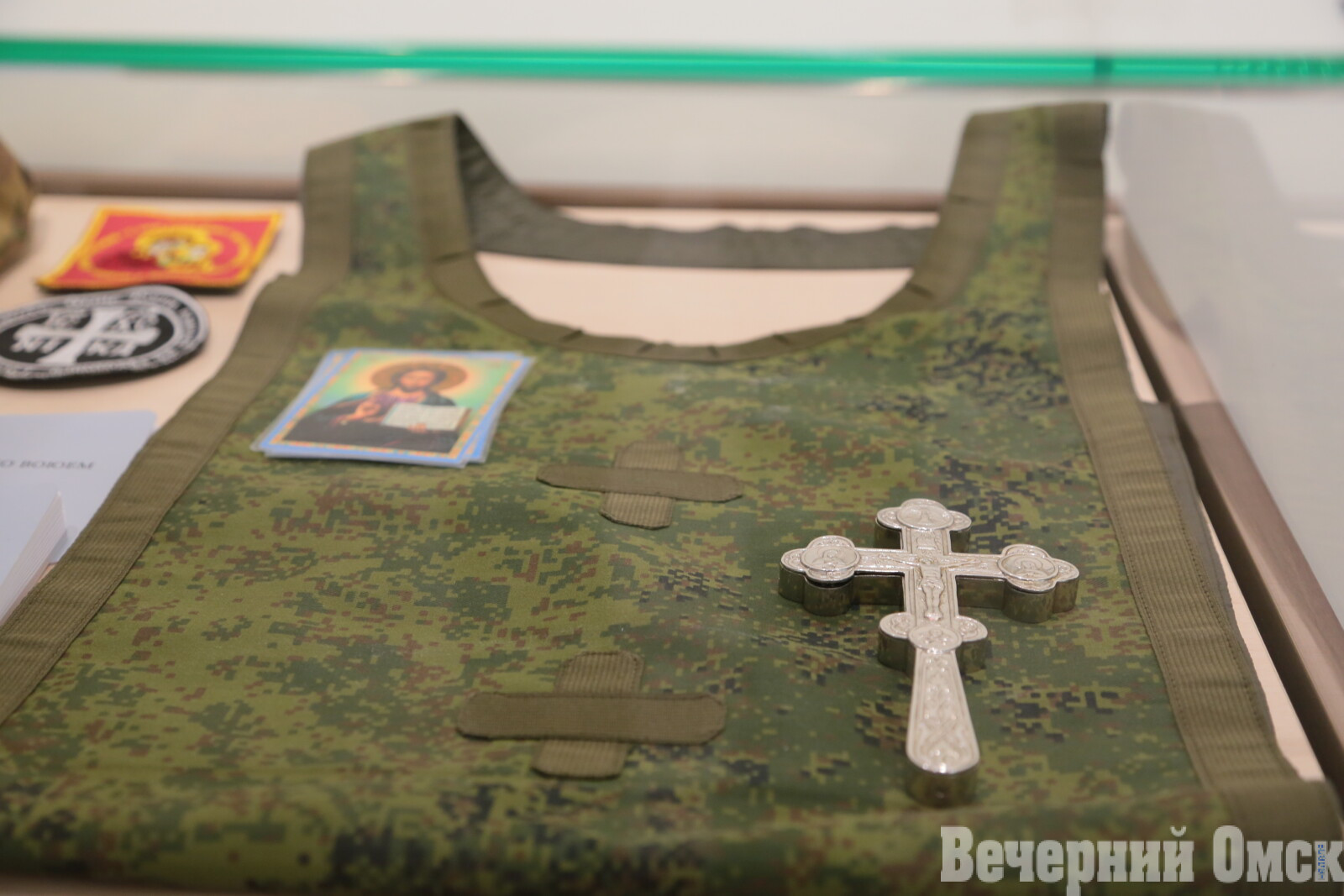 Отдельную витрину авторы проекта посвятили жизни и деятельности Владыки Феодосия. А ближе к финалу экспозиции – раздел, посвященный службе священников на специальной военной операции. Над витриной – боевой стяг «Спас нерукотворный».