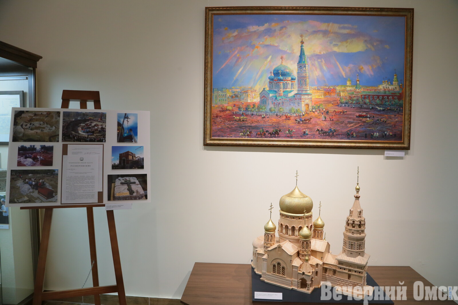 Вторая часть выставки рассказывает о возрождении и о современности. Здесь книги, архивные снимки, документы, артефакты. Кокарда и монеты с раскопок фундамента Воскресенского собора, фрагмент складня и напрестольный крест, свидетельство встречи рабочей группы по воссозданию Знамени Ермака… Точка перехода от прошлого к настоящему – центральная стена зала, где висит большое живописное полотно Сергея СОЧИВКО «Богом любимый град Омск» с сияющим над собором небом, которое, по словам художника, он увидел наяву. А под картиной – детализированный макет Успенского собора, созданный энтузиастом Дмитрием ЦАРЕГОРОДЦЕВЫМ всего за два месяца специально к открытию выставки.