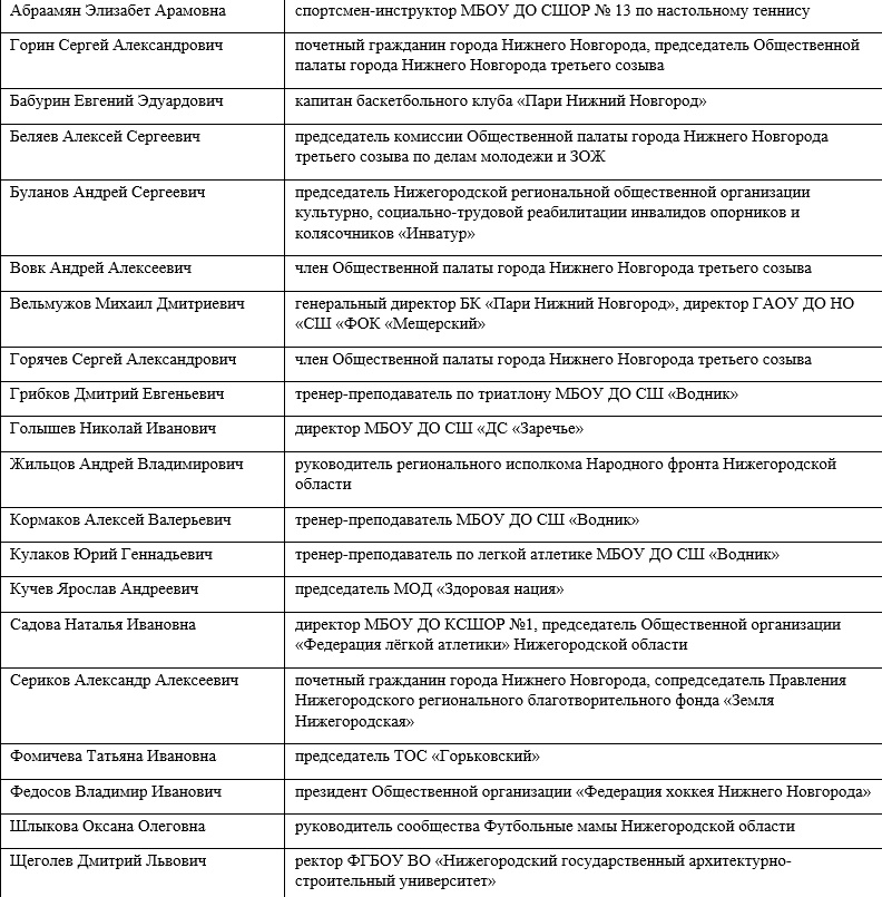 В его состав вошли спортсмены, общественники и местные жители. В списке, например, значатся представители Общественной палаты, капитан БК «Пари Нижний Новгород» Евгений Бабурин, ректор ННГАСУ Дмитрий Щеголев и тренера-преподаватели спортшколы «Водник».