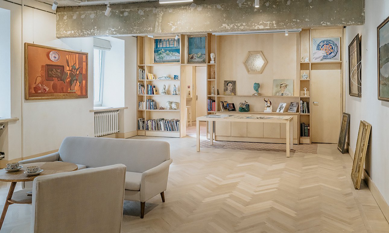 Впрочем, сейчас пространство полностью модернизировано. Архитектурный проект создал Игорь Чиркин (бюро Project Eleven), на счету которого оформление выставок в Музее русского импрессионизма, павильон «Школа» в парке «Музеон» и многое другое. Архитектор создал «идеальный позднесоветский» дизайн (в котором на самом деле много от лаконичного скандинавского) с большими светлыми пространствами, отделанными деревом, оформил в простенке между комнатами окошко фирменной для Масловки шестиугольной формы — словом, сделал дух этого места более утрированным, экспозиционным.
