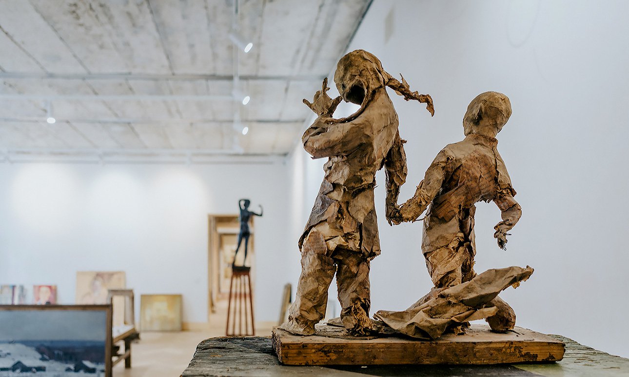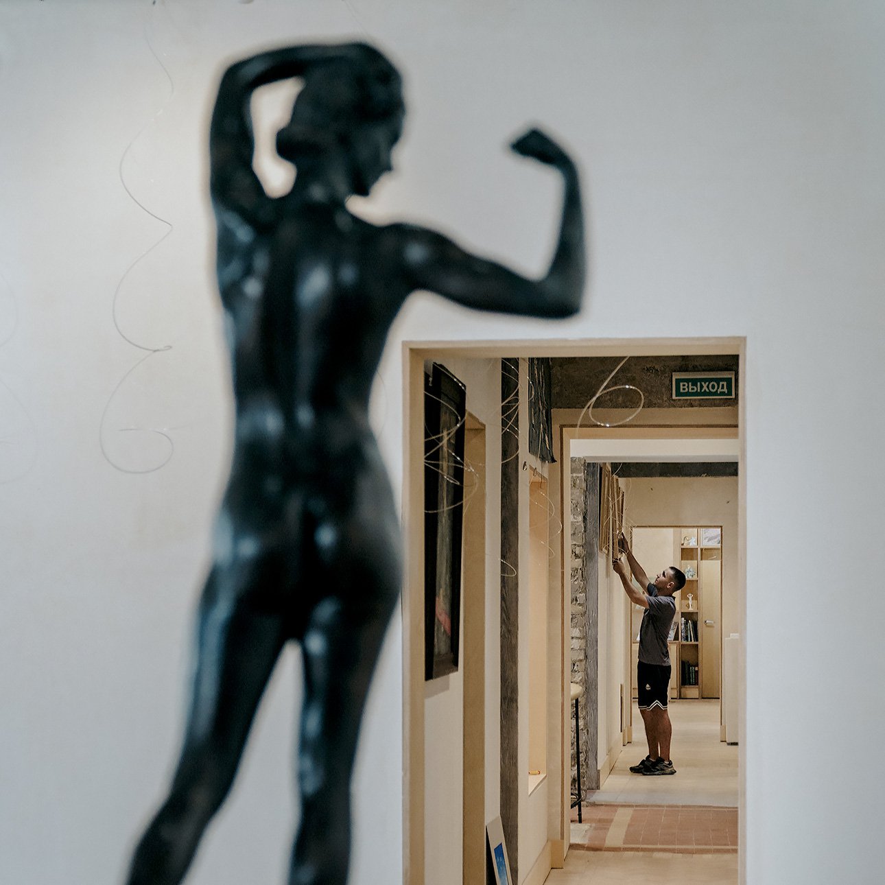 Одна из нескольких тем, которые обыгрывает выставка, — история залов, где расположился музей. Пространство это действительно интересное. Здесь, на площади 300 кв. м на третьем этаже дома № 3 (вход со двора через арку), долгие десятилетия работал домовый детский сад. В нем спали, ели и сопели поколения художественной интеллигенции и богемы. Садик закрылся совсем недавно, в 2021 году, и в его стенах до сих пор, кажется, слышны детские голоса, как будто тут стоит гигантский дистиллятор Детского Смеха Федора Симеоновича Киврина из повести братьев Стругацких «Понедельник начинается в субботу».