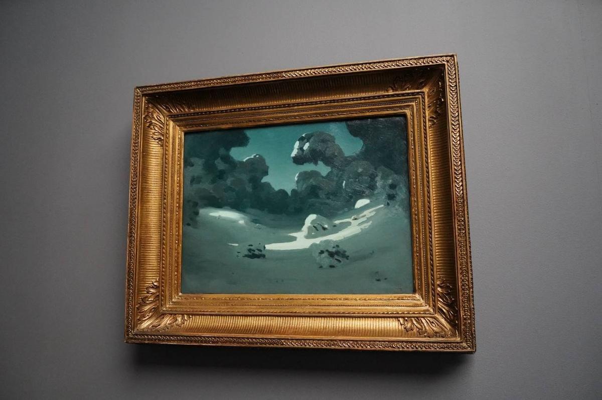 И наконец кульминация экспозиции — отдельный зал и «Лунная ночь на Днепре». 1880 год. Базовые истории о картине. Раз: Куинджи показывал эту работу на выставке одной картины (новаторский подход на тот момент) и ему не верили — зрители то искали скрытый источник света за холстом, то просто называли всё хитрым трюком или происками нечистого. Два: картину увидел великий князь Константин Константинович Романов, буквально влюбился в полотно, выкупил и взял с собой в кругосветное морское путешествие; от влажности полотно пострадало, но Архип Куинджи позже вернул ему первозданную красоту.