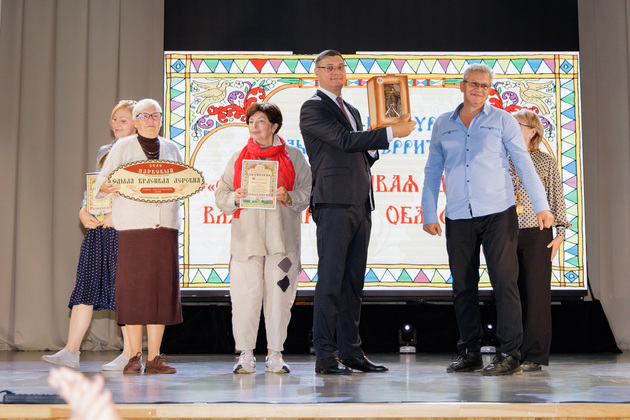 И сперва вручил награды победителям в новой номинация «Самые титулованные», где отметили наиболее активных  участников конкурса за годы его проведения, показавшим высокие результаты.  Победителям вручаются таблички, дипломы и сертификаты на 50 тысяч рублей. Их обладателями стали: село Верхозерье Меленковского района, село Весь Суздальского района, село Махра Александровского района, село Парковый Юрьев-Польского района.