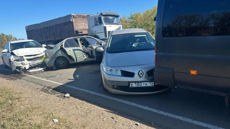 В Ковылкинском районе Мордовии в среду произошла авария на 76 километре автодороги «РузаевкаКовылкино – Торбеево». Как сообщает Министерство внутренних дел по РМ в 11:40 39-летний водитель «Шевроле Круз» врезался в стоящий «Ниссан Альмера». От удара «Ниссан» отбросило на стоявшие в ожидании разрешающего сигнала регулировщика «Рено Меган» и автобус «Форд Транзит».