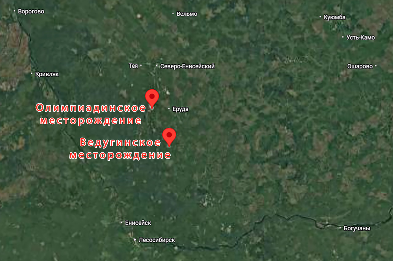 Ведуга расположена в Северо-Енисейском районе, известном своими золотыми запасами. Именно здесь на других площадках, в том числе Олимпиадинском месторождении в 60 км от Ведуги, осваивает недра крупнейшая золотодобывающая компания «Полюс».