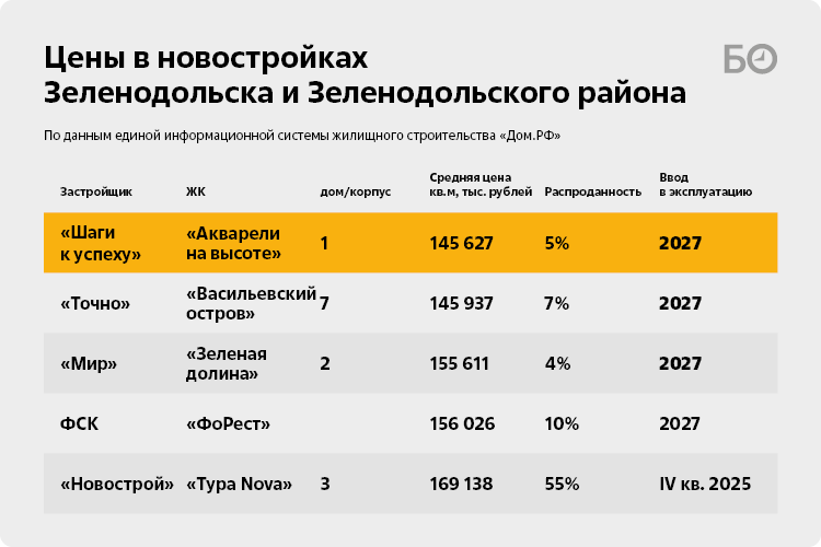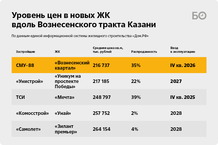- Мамадышский тракт. В этой локации три строящихся объекта, два из которых сдают в III квартале 2025 года. У ПИКа в ЖК «Нокса парк» средняя цена квадратного метра в доме №4 составляет 199,5 тыс. рублей, распродано 98%. Для сравнения: «Унистрой» распродал 84% квартир в доме №1 ЖК «Весна», но ценник там на 11% выше и составляет 221,9 тыс. рублей. Третий объект также строит «Унистрой» — это пятый дом ЖК «Лето», средняя цена «квадрата» в котором при распроданности в 4% и вводе в эксплуатацию в 2026-м составляет 223,2 тыс. рублей.