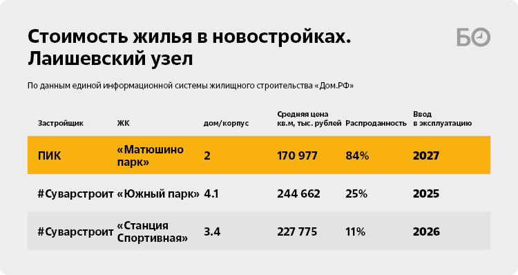 - «Лаишевский узел». Тут #Суварстроит предлагает в доме №4.1 ЖК «Южный парк» квартиры в среднем по 244,6 тыс. рублей за квадратный метр, ввод в эксплуатацию — 2025 год, распродано 25%. Напротив через железную дорогу ПИК в партнерстве с «Ак Барс Холдингом» строит «Матюшино парк». И там на 73 тыс., или 30%, дешевле, но ввод в эксплуатацию в 2027-м, а распродано уже 84% квартир. Схожая ситуация и в третьем строящемся объекте локации — #Суварстроит предлагает в ЖК «Станция Спортивная» квартиры в доме №3.4 в среднем по 227,7 тыс. рублей за «квадрат», ввод в эксплуатацию — 2026 год, распродано 11% квартир.