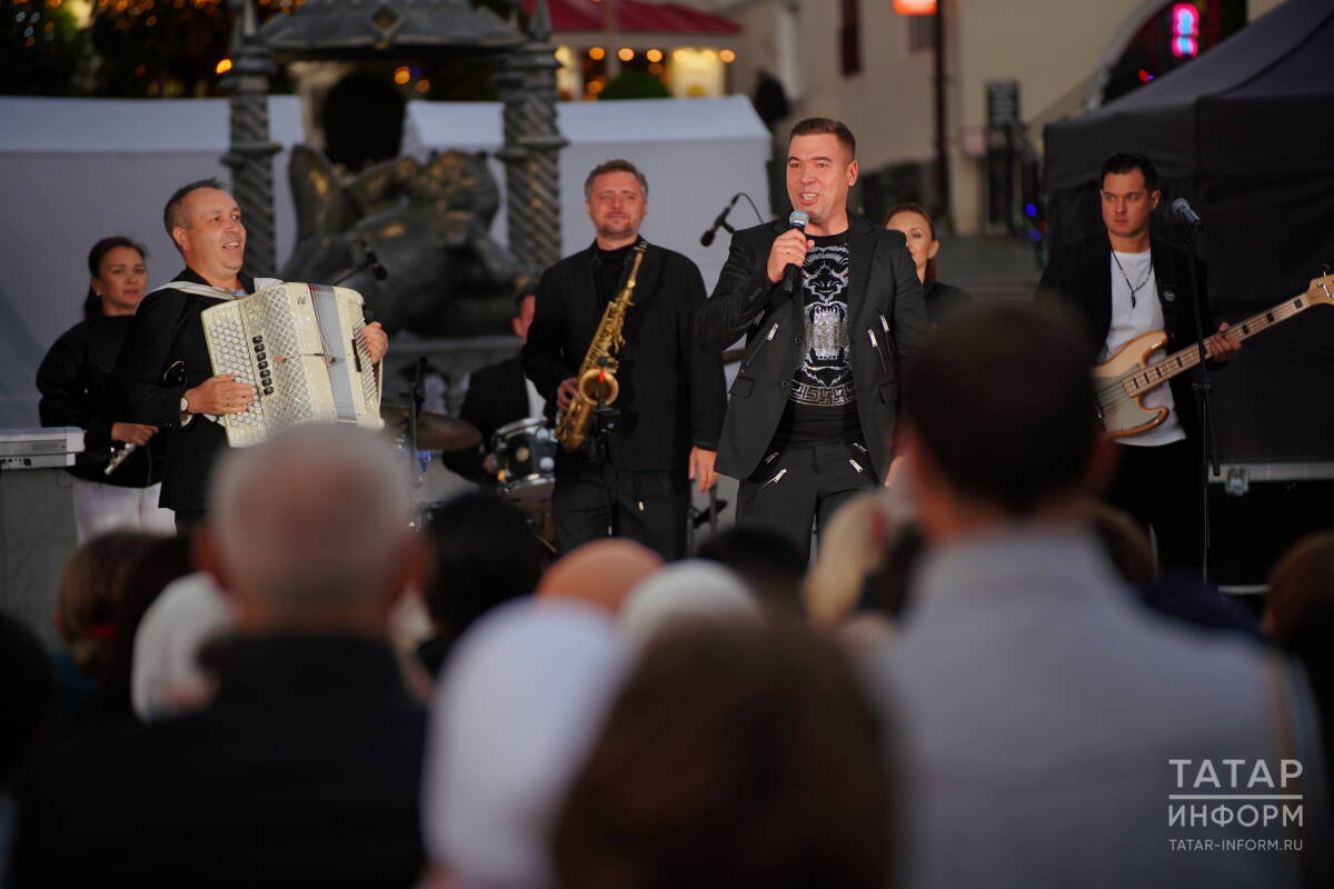 На улице Баумана в Казани народный артист ТатарстанаФилюс Кагировв сопровождении инструментального ансамбля «Мирас» исполнил свои самые популярные песни.