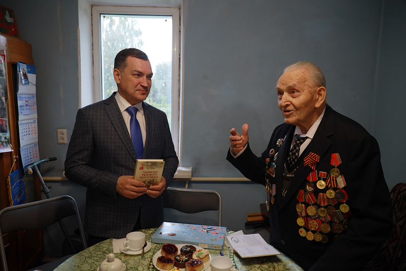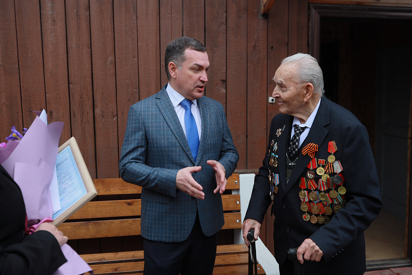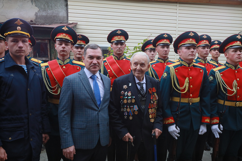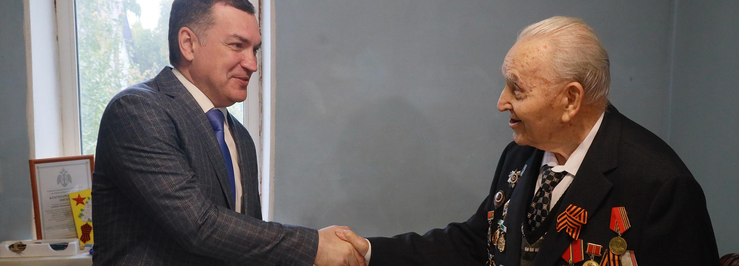 Глава города навестил Владимира Васильевича Сбоева и поздравил его с солидным юбилеем. Именинник встречал гостей в парадном костюме с орденами и медалями на груди.