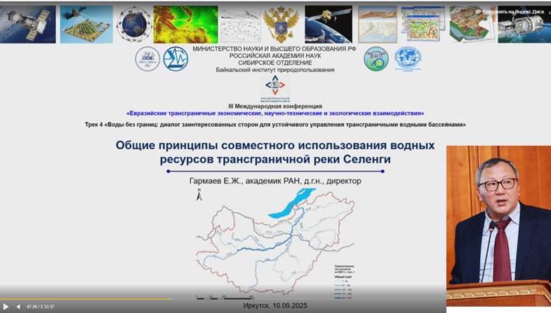 * На секции «Воды без границ: диалог заинтересованных сторон в целях устойчивого трансграничного управления водными бассейнами» с онлайн-докладом «Общие принципы совместного использования водных ресурсов трансграничной реки Селенги» выступил директор Института, академик РАН Ендон Жамьянович Гармаев.