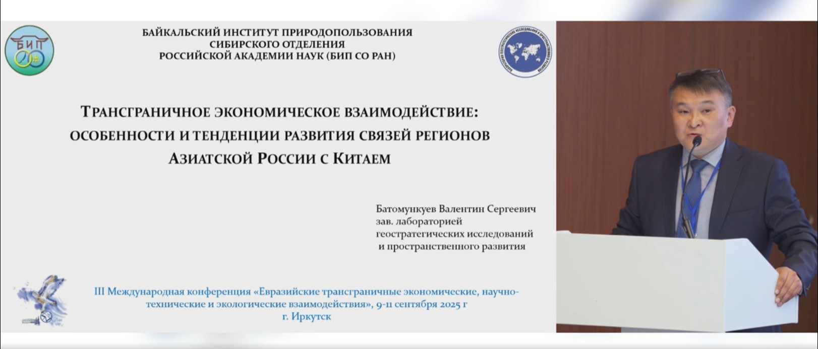 * На секции «Трансграничные взаимодействия России, Китая и Монголии» с докладом «Трансграничное экономическое взаимодействие: особенности и тенденции развития связей субъектов Азиатской России с Китаем» выступил заведующий лабораторией геостратегических исследований и пространственного развития, заместитель директора по научной работе Валентин Сергеевич Батомункуев.