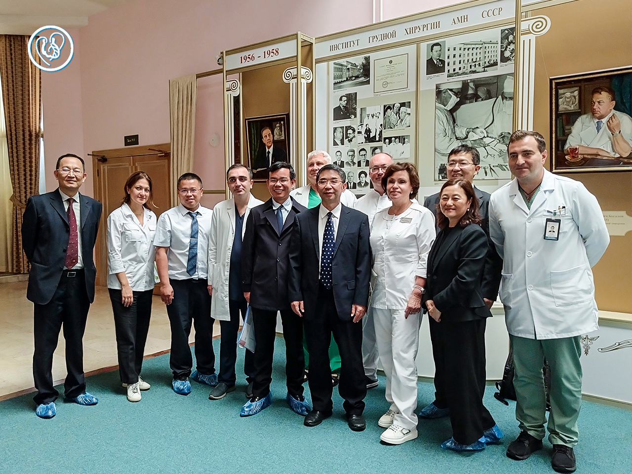 Визит завершился коллективным фото в вестибюле Бакулевского центра рядом с портретами основателей клиники – академиков А.Н. Бакулева и В.И. Бураковского.