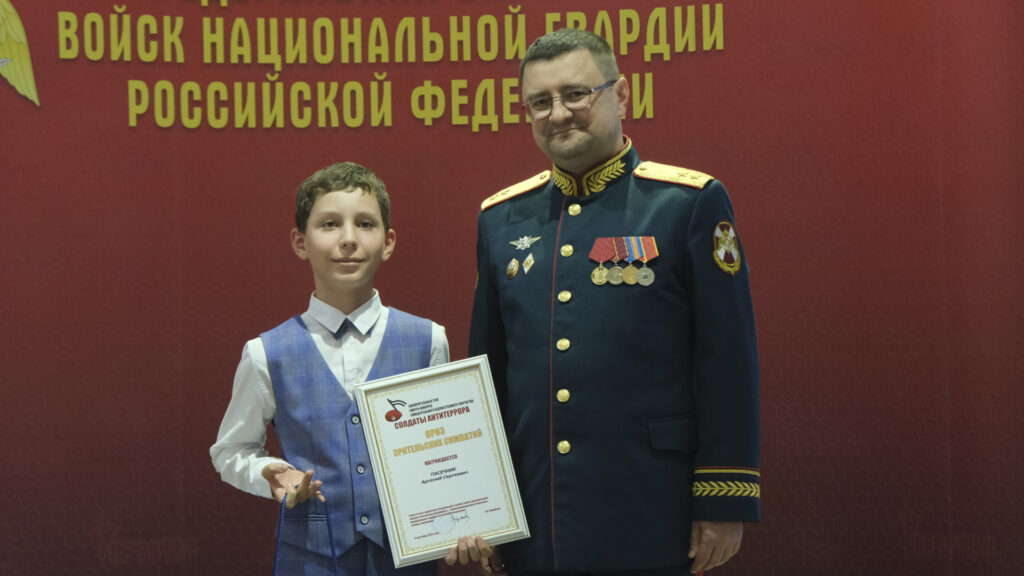 Сотрудник калининградского ОМОН «Град» Росгвардии удостоен специального приза в номинации «Сольное пение». А приз зрительских симпатий из рук генерал-лейтенанта Дениса Ермакова получил самый юный участник конкурса – 10-летний Арсений – сын сотрудника ОМОН «Град» Управления Росгвардии по Калининградской области.
