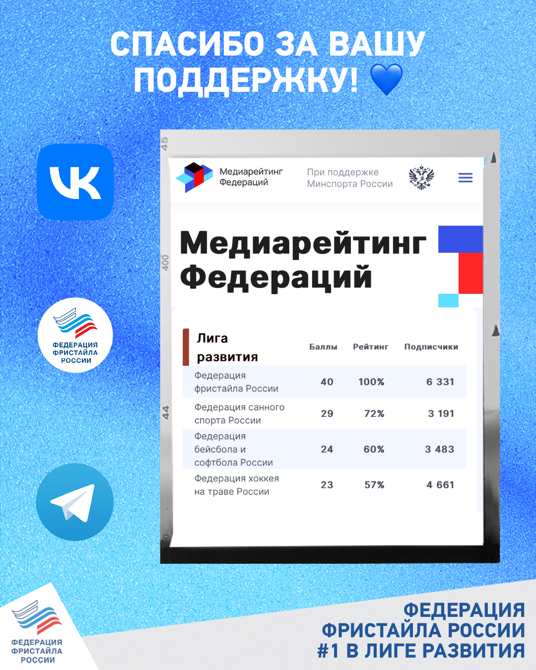 Дорогие фристайлисты и болельщики — этим летом мы достигли новых высот благодаря вашей активности! Федерация фристайла России стала первой в Лиге развития среди федераций олимпийских видов спорта!