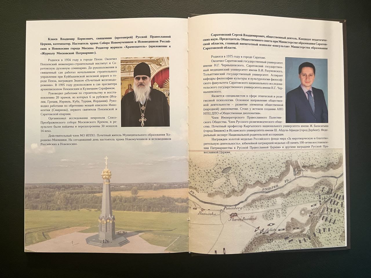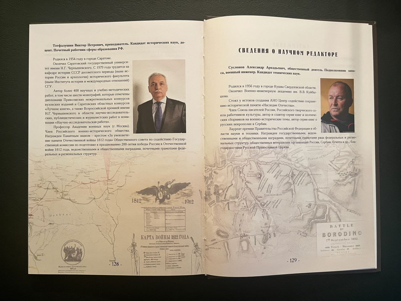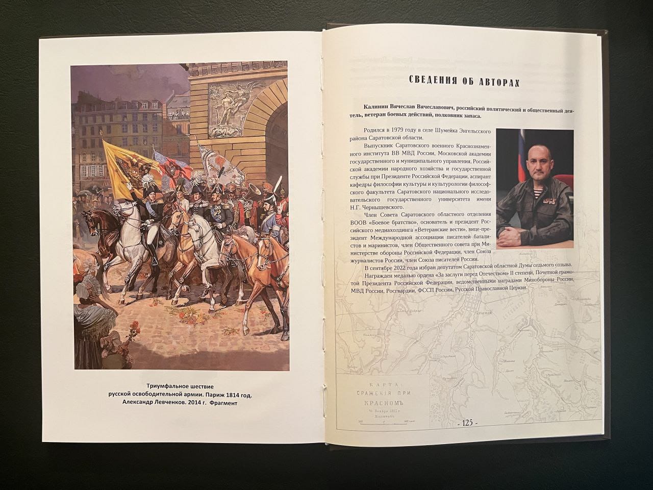 Авторами книги выступили известные на федеральном уровне и в регионе люди: член Общественного совета при Министерстве обороны России, президент Медиахолдинга «Ветеранские вести», ветеран боевых действий, полковник запаса Вячеслав Калинин, председатель Общественного совета при Министерстве образования Саратовской области, психолог Сергей Саратовский, священник Владимир Клюев и историк Виктор Тотфалушин при участии лауреата премии Правительства РФ, ветерана военной службы, историка Александра Суслонова.