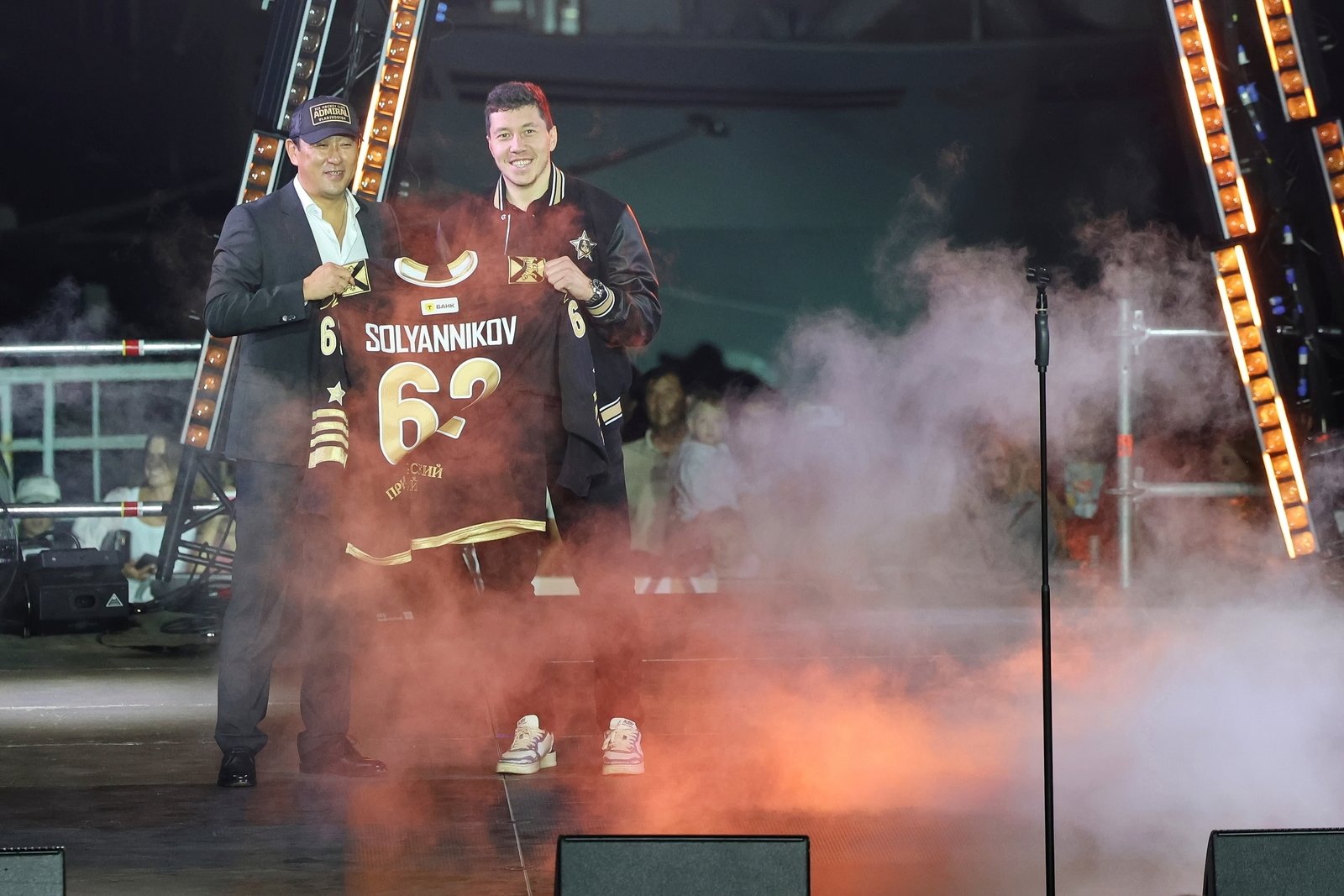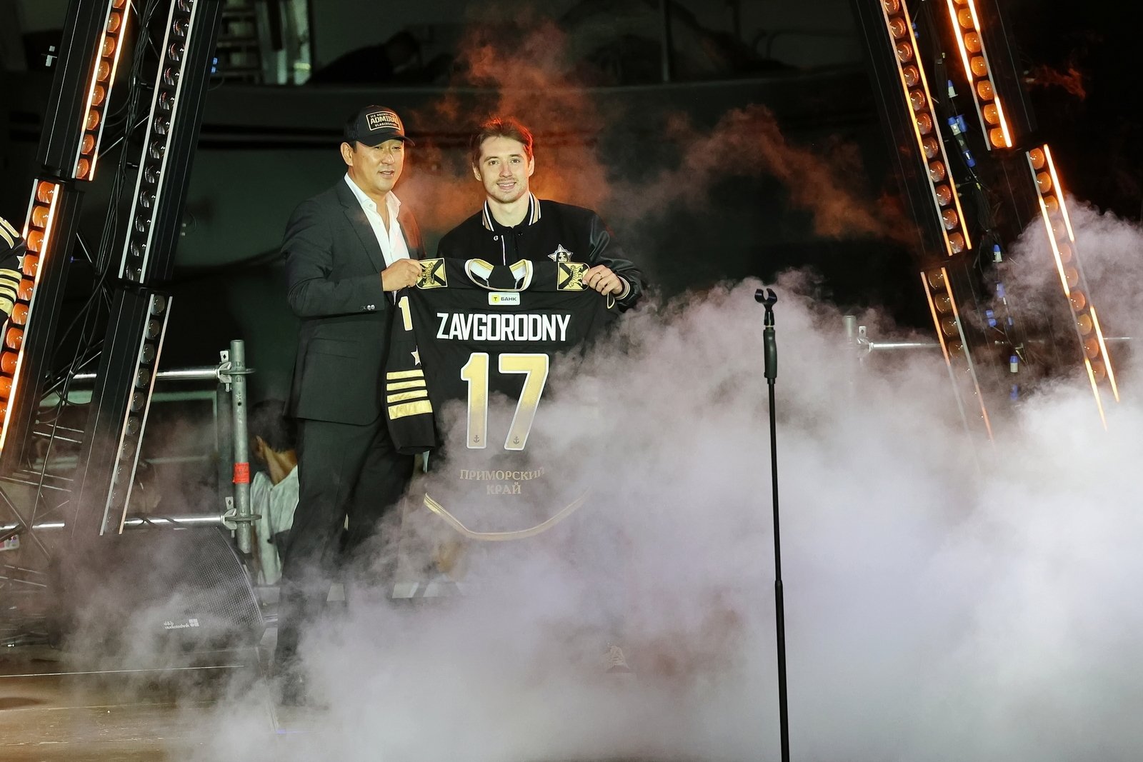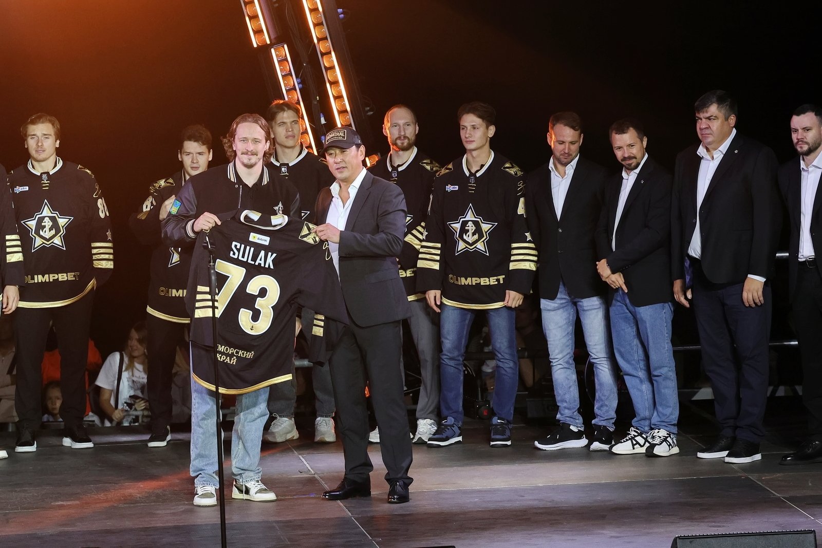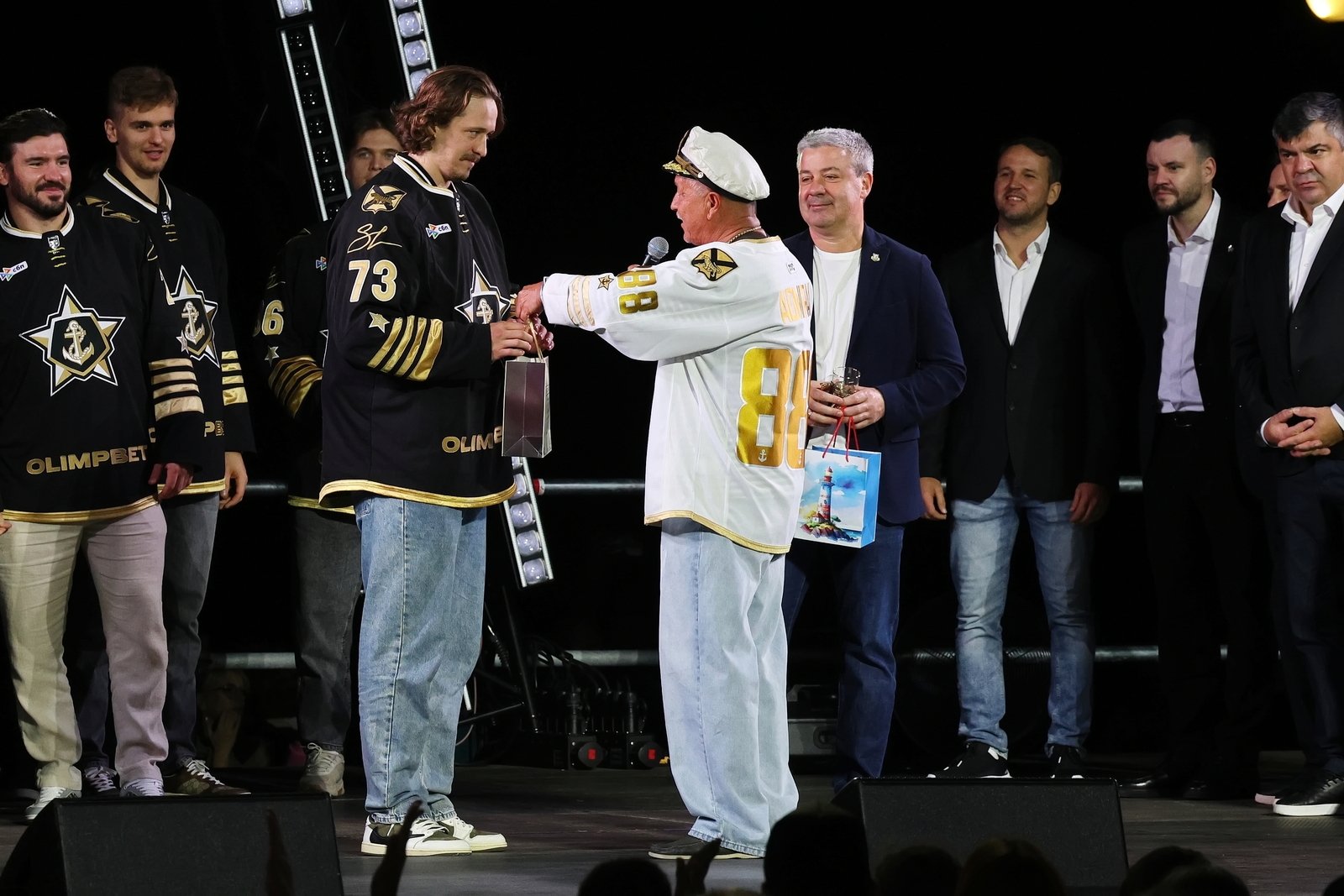 Затем состоялась церемония представления команды: каждый игрок, тренер и член персонала поднимался на сцену. Генеральный директор клуба Алексей Ан вручил хоккеистам именные игровые свитеры.
