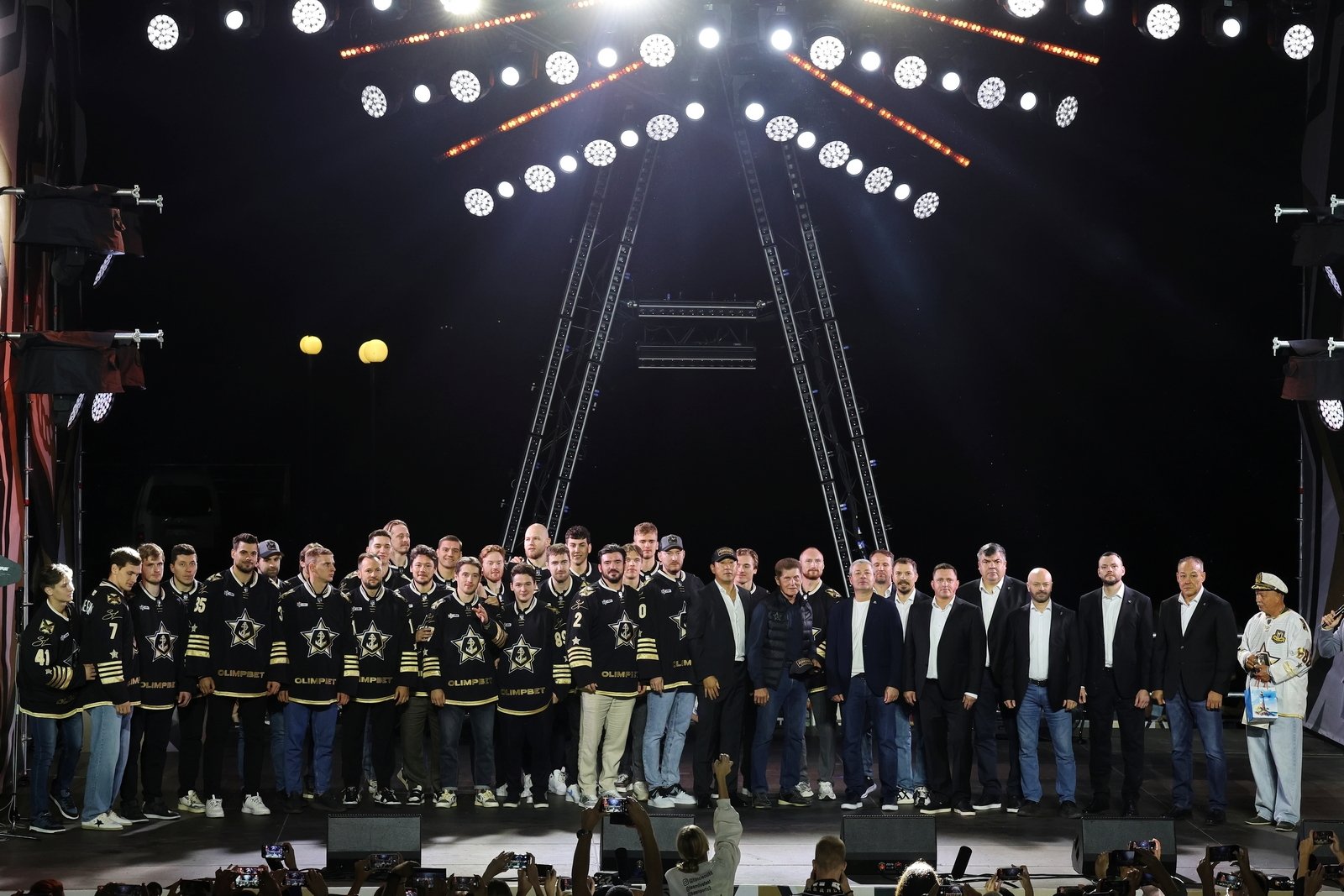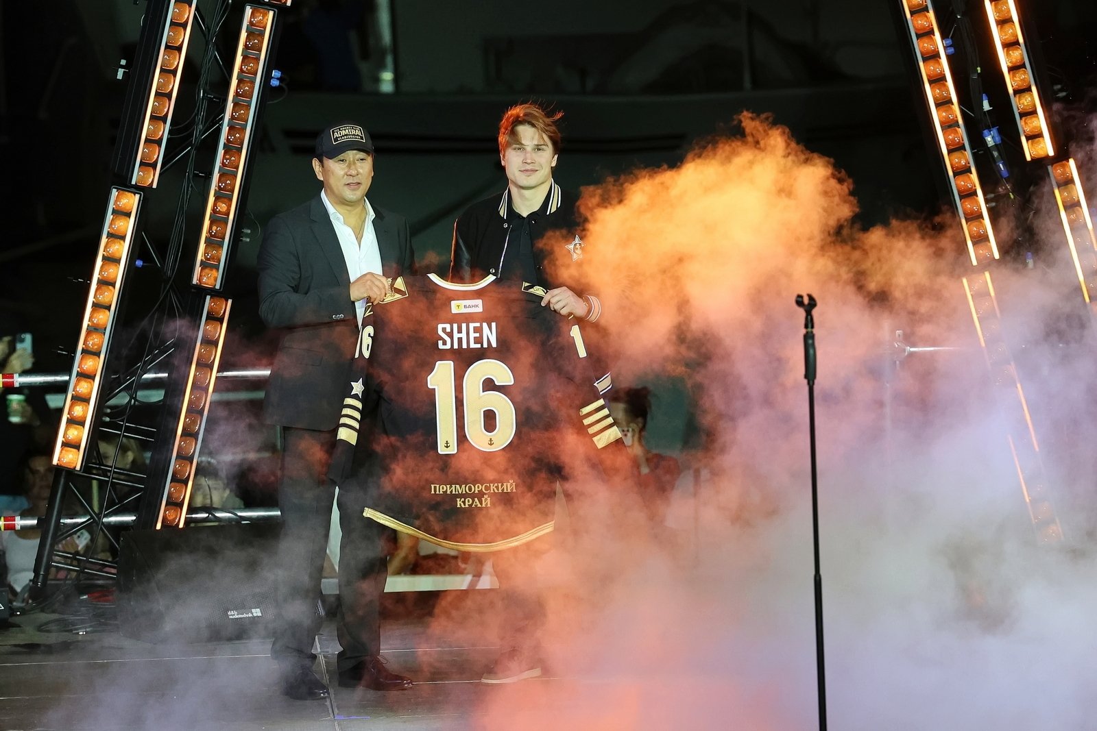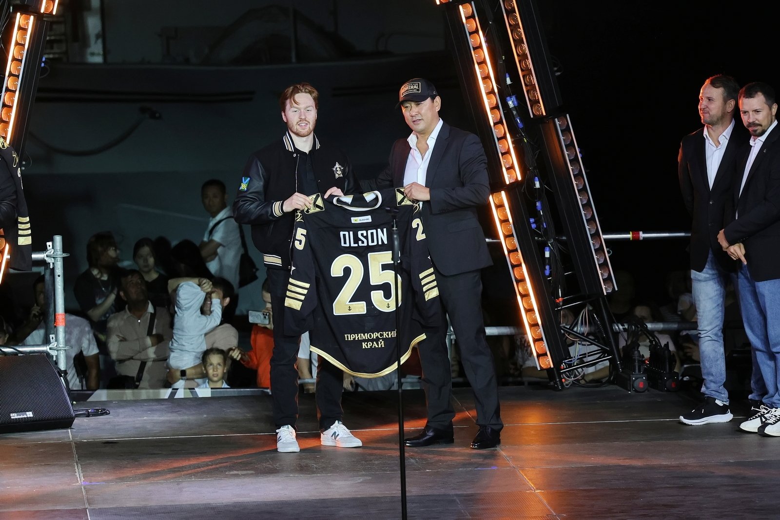Затем состоялась церемония представления команды: каждый игрок, тренер и член персонала поднимался на сцену. Генеральный директор клуба Алексей Ан вручил хоккеистам именные игровые свитеры.