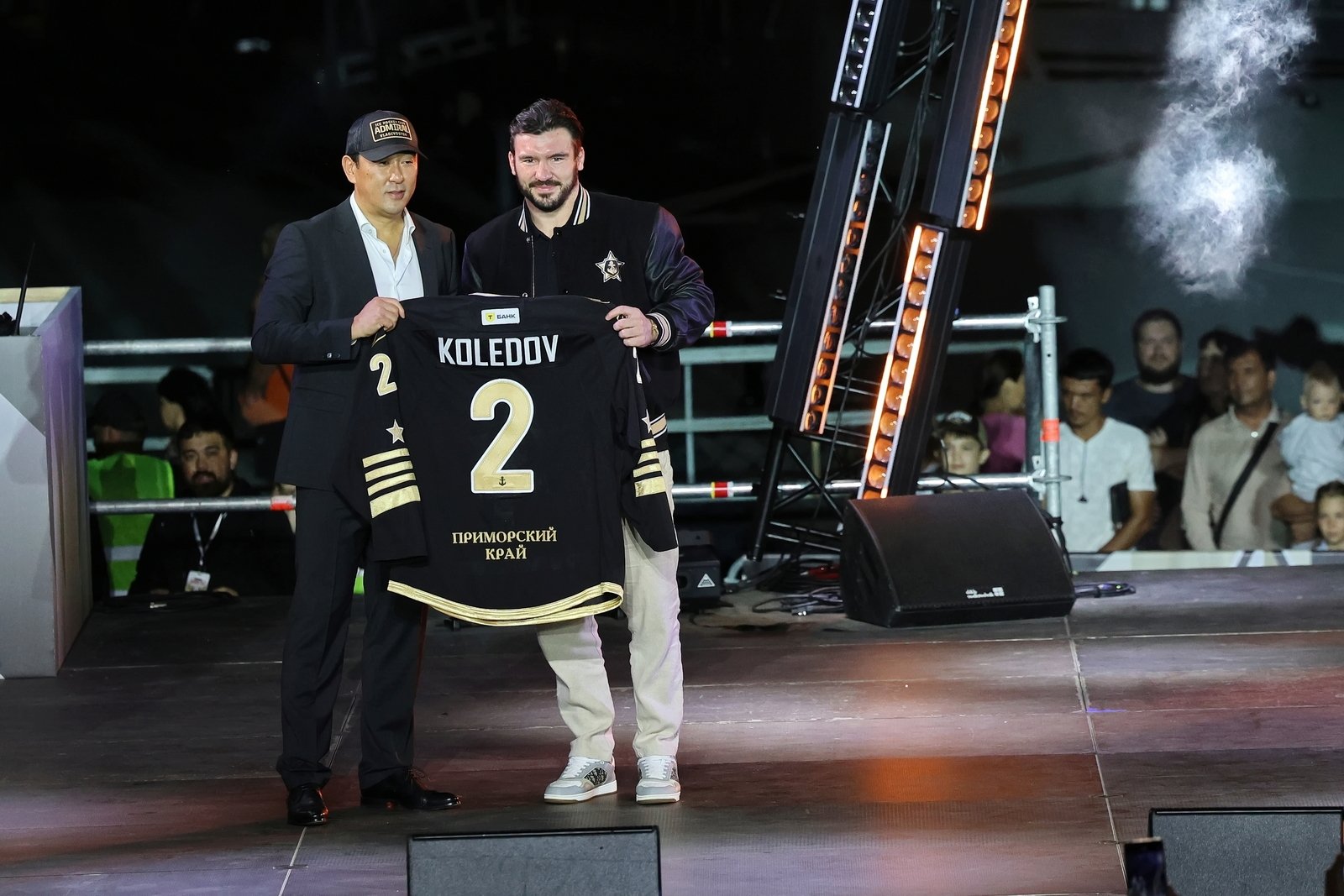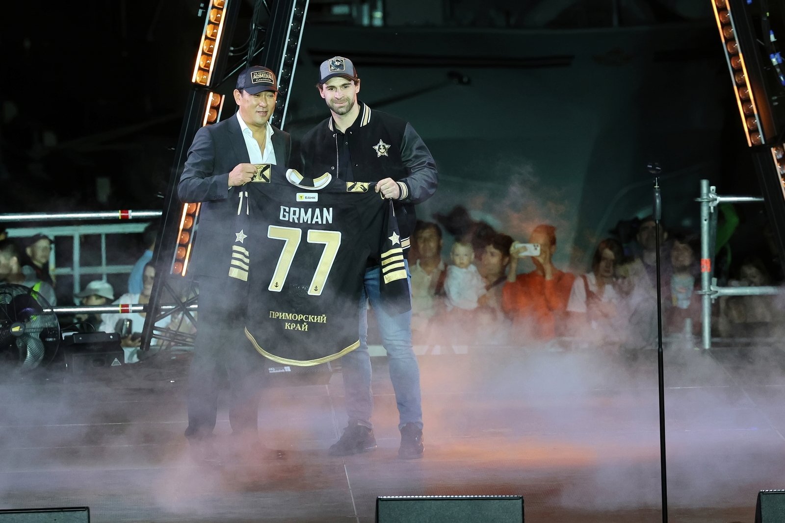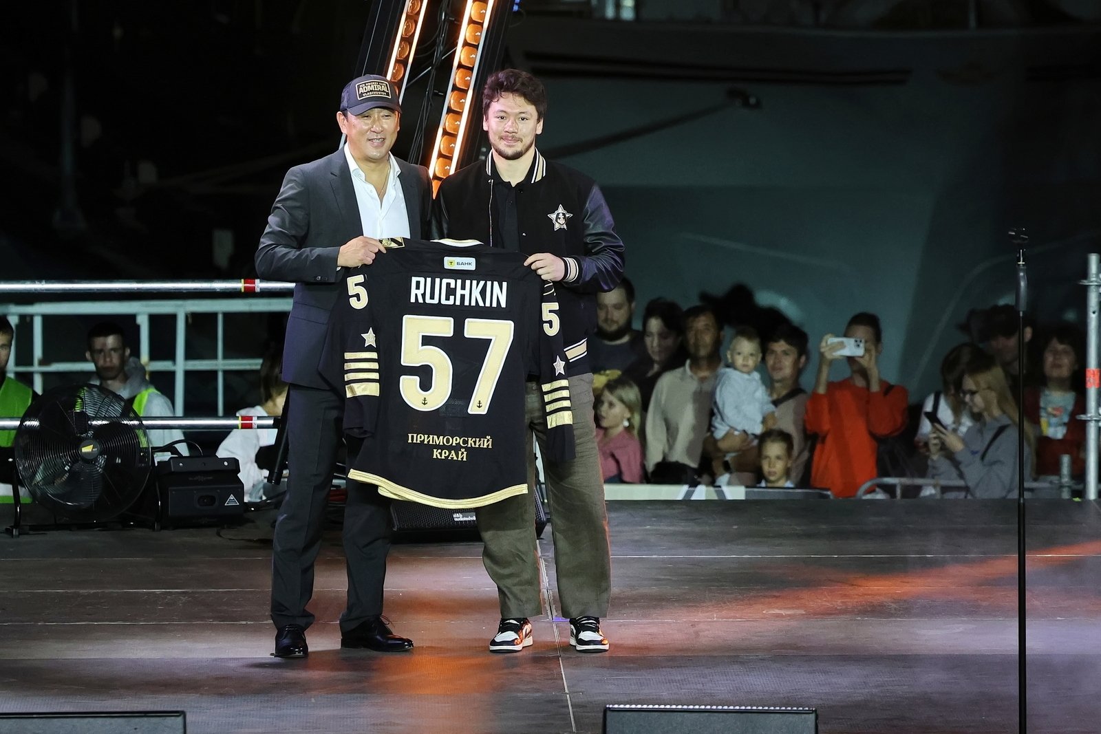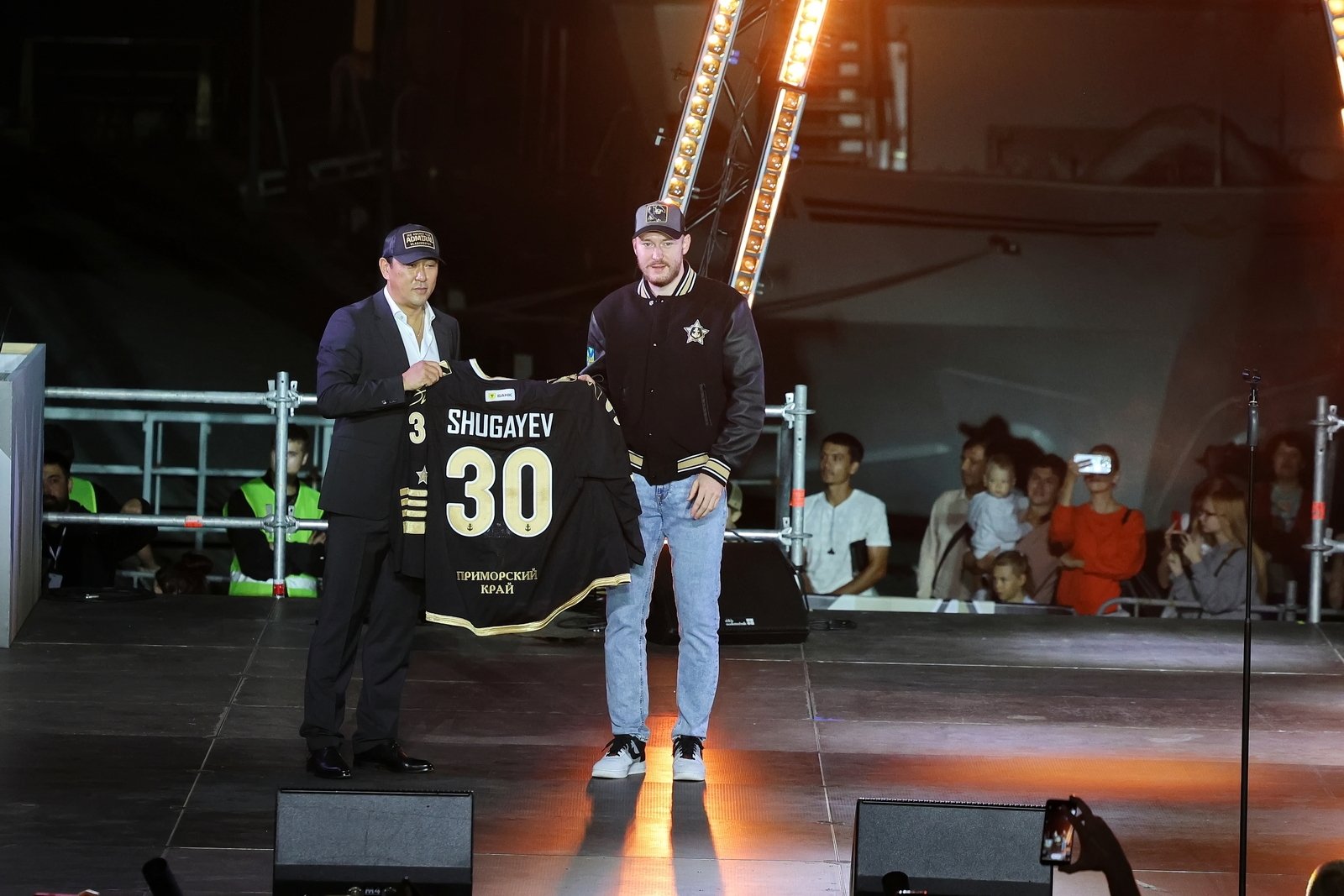 Затем состоялась церемония представления команды: каждый игрок, тренер и член персонала поднимался на сцену. Генеральный директор клуба Алексей Ан вручил хоккеистам именные игровые свитеры.