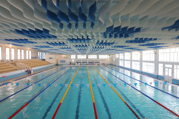 Приведены в порядок помещения большой и средней чаш плавательного бассейна. Покрашены стены, установлены новые энергоэффективные светодиодные светильники и прожекторы, обновлены вентиляционная система и пожарная сигнализация. Отремонтированы перекрытия над чашами, установлен современный акустический подвесной потолок. Специализированные ламели улучшили эргономику пространства и обеспечили высокую эффективность звукопоглощения – теперь даже во время массовых мероприятий в бассейне не будет громкого эха.