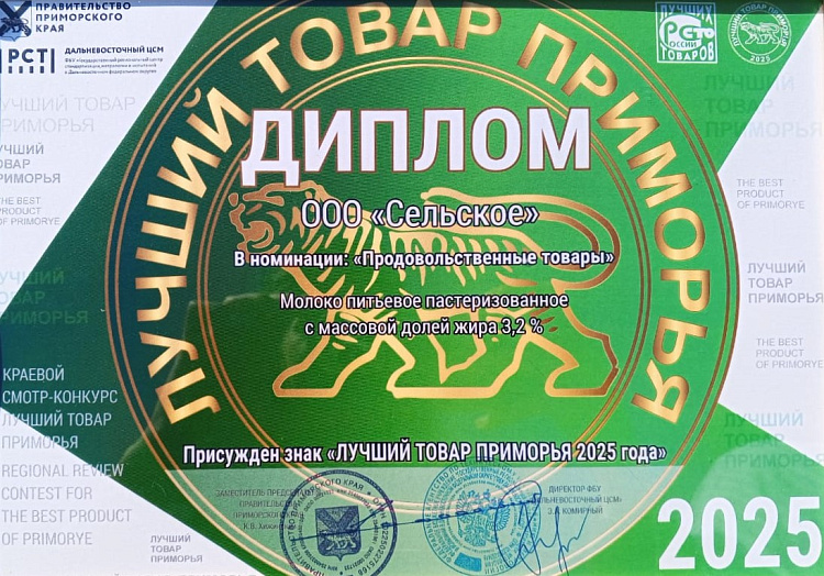 Молоко компании «Сельское», резидента свободного порта Владивосток (СПВ), удостоено знака «Лучший товар Приморья 2025» в номинации «Продовольственные товары» по итогам выставки «Приморские продукты питания». В создание молочной фермы в Ольгинском районе Приморского края инвестор в рамках соглашения с Корпорацией развития Дальнего Востока и Арктики (КРДВ) вложил 73 млн рублей, создано 110 новых рабочих мест для местных жителей.