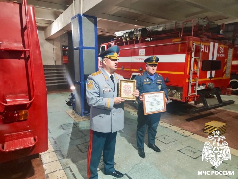 Руководитель регионального главка поздравил личный состав пожарно-спасательного гарнизона с 60-летним юбилеем Печорской пожарной охраны и вручил икону Божьей Матери «Неопалимая Купина».