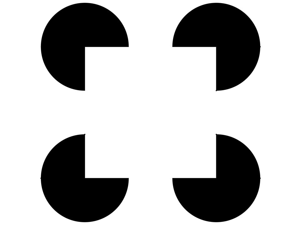 Иллюзия — это когда мы видим и воспринимаем объект, который не соответствует сенсорному сигналу, поступающему в глаза. Взять, к примеру, широко известный квадрат Канижа. Четыре «пакмана» по углам дают сенсорный сигнал, а видим мы белый квадрат, которого на самом деле не существует.