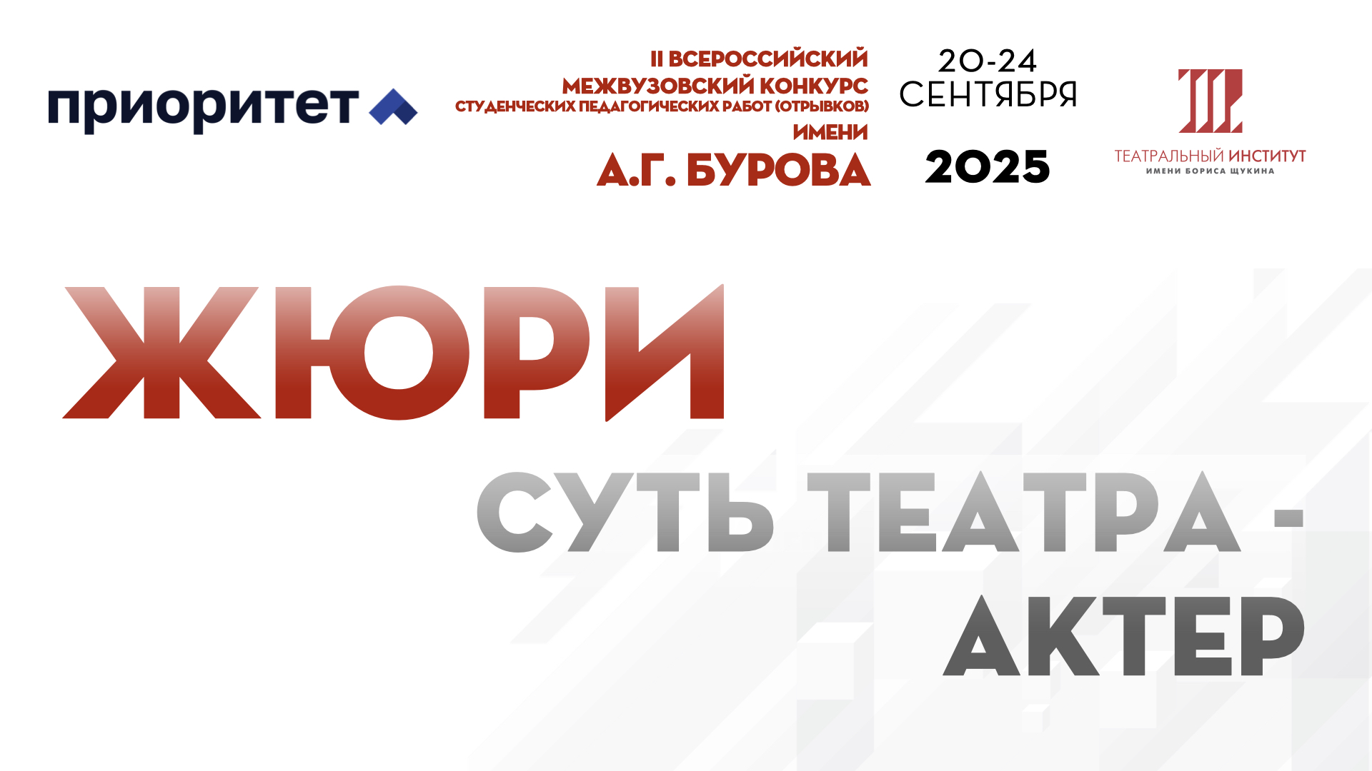 Стал известен состав жюри III Всероссийского межвузовского конкурса педагогических отрывков имени заслуженного деятеля искусств РФ А.Г.Бурова «Суть театра – актер». (2025 год)