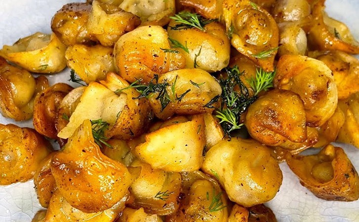 Обжаривайте на среднем огне до румяной корочки, аккуратно переворачивая силиконовой лопаткой, чтобы не повредить их целостность. Когда пельмени станут золотистыми, влейте разведённый в воде сухой бульон или просто воду.